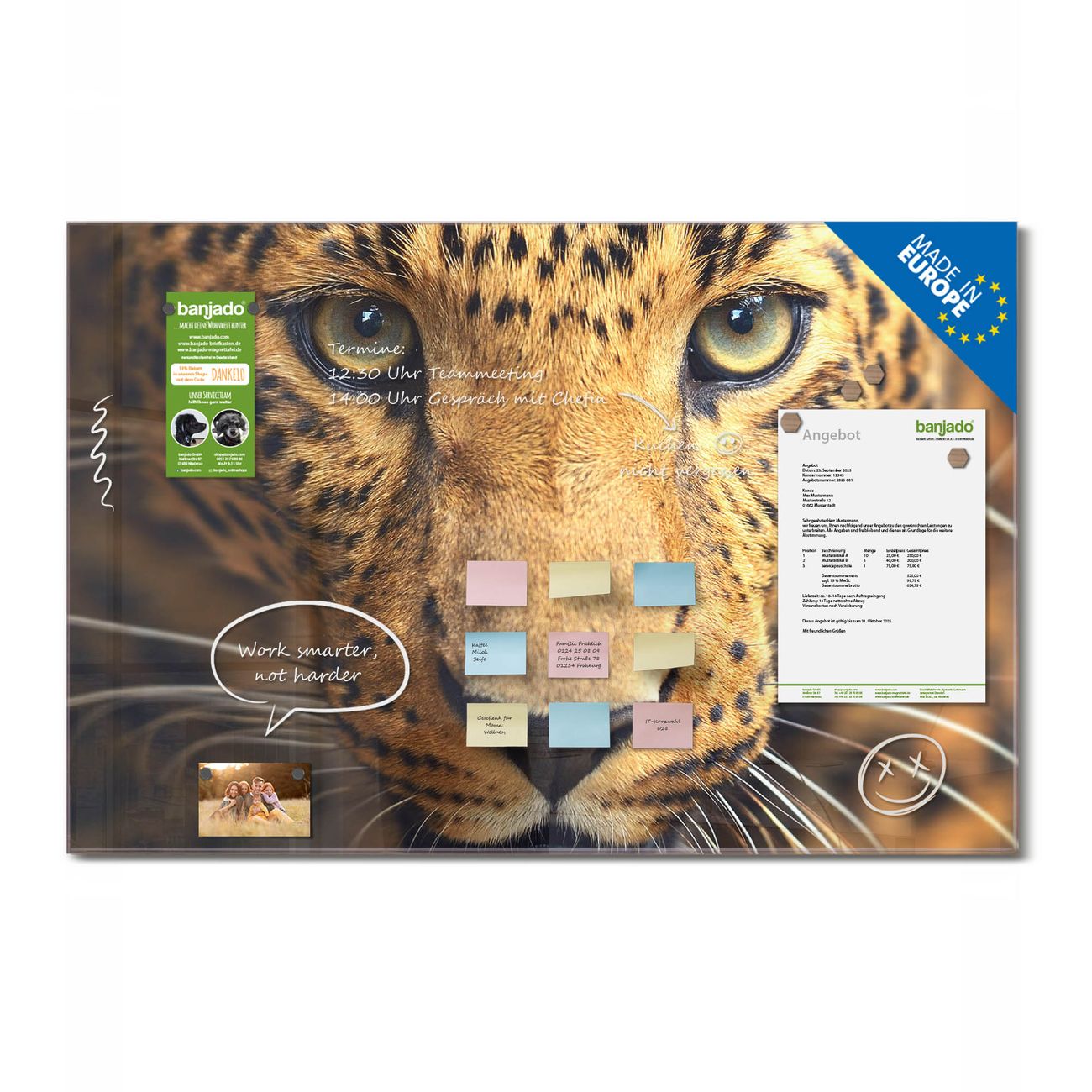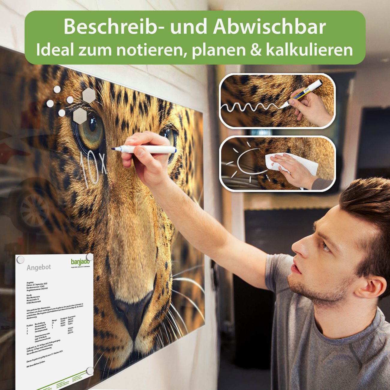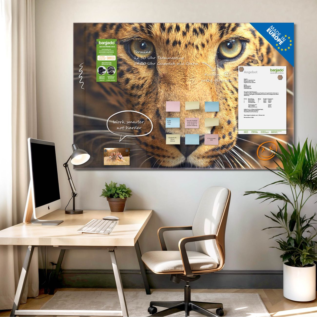 Jede Glas Magnettafel wird in unserer Werkstatt von Hand gefertigt und sorgfältig geprüft. So erhalten Sie ein echtes Qualitätsprodukt, das Funktion und Ästhetik perfekt vereint.?? Warum banjado?