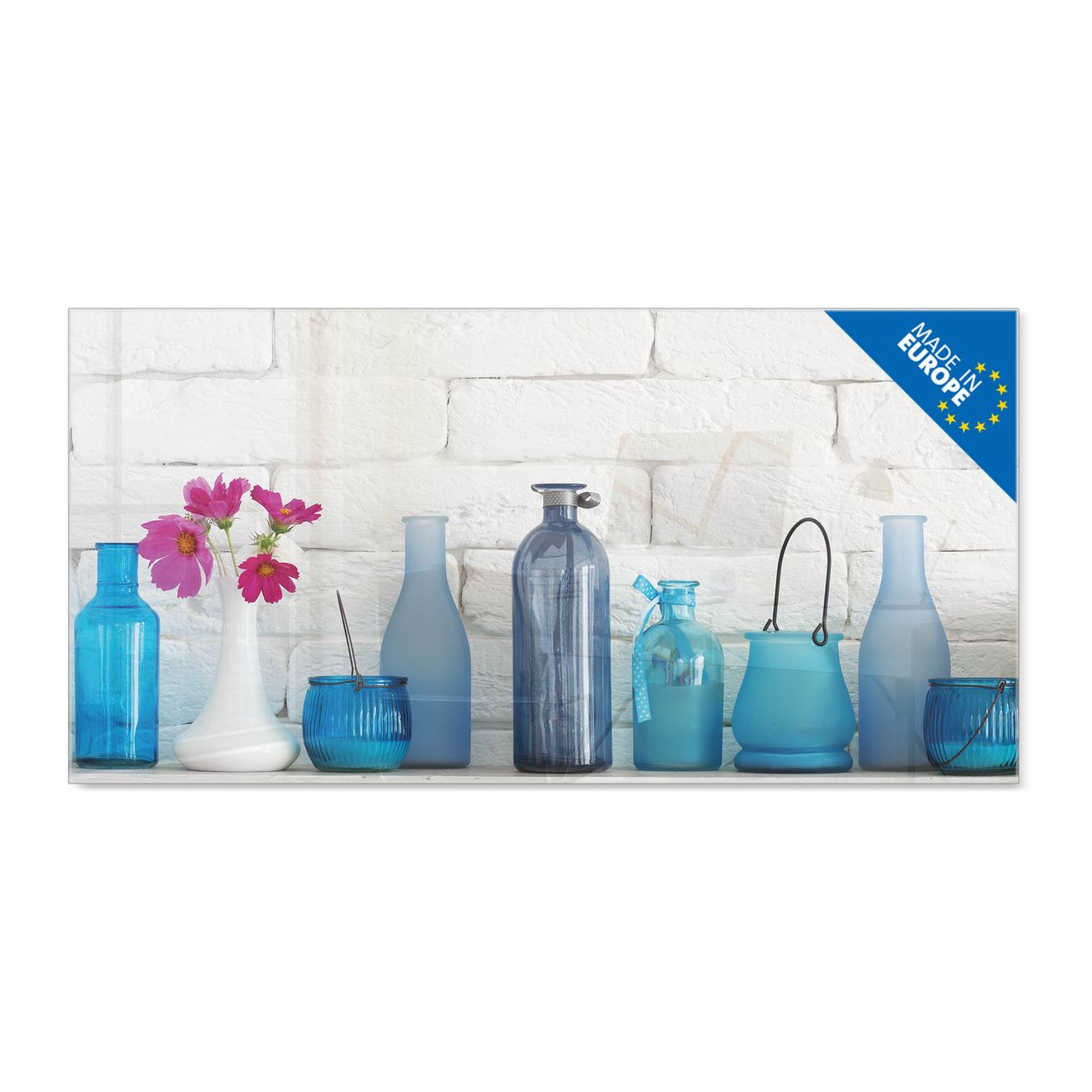Material: 4mm Sicherheitsglas mit Metallrückwand Eigenschaften: beschreibbar, magnetisch, kratzfest Maße: 100x50x0,6cm, 7,50kg schwer Motiv Nummer 11179 Dekoartikel Blau Zubehör: inklusive 4 Neodym-Magnete
