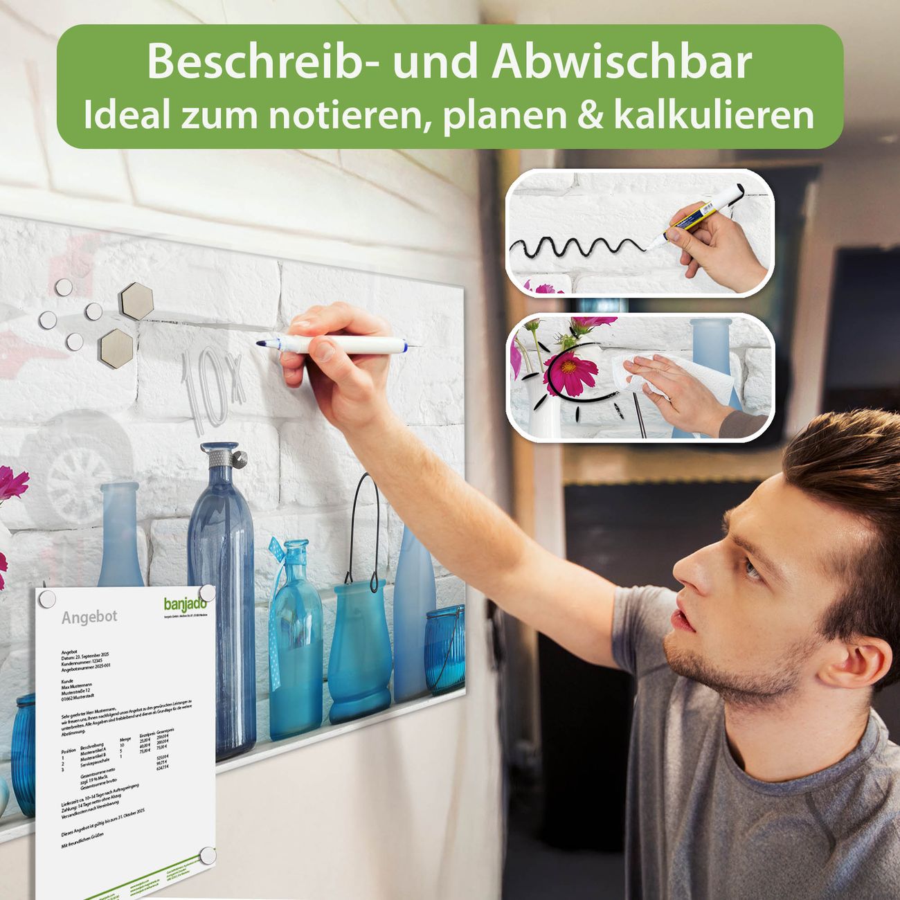 Bitte beachten Sie, dass ausschliessliche spezielle Magnete an der Glastafel haften. Wir empfehlen banjado Neodym Magnete, diese sind durch uns auf Wirksamkeit geprüft.