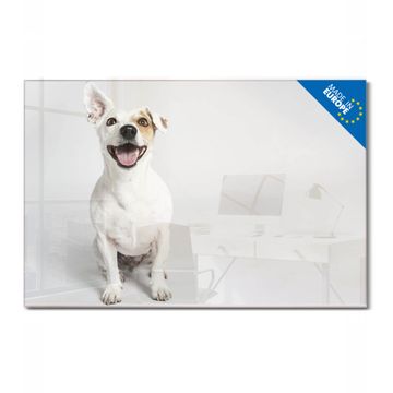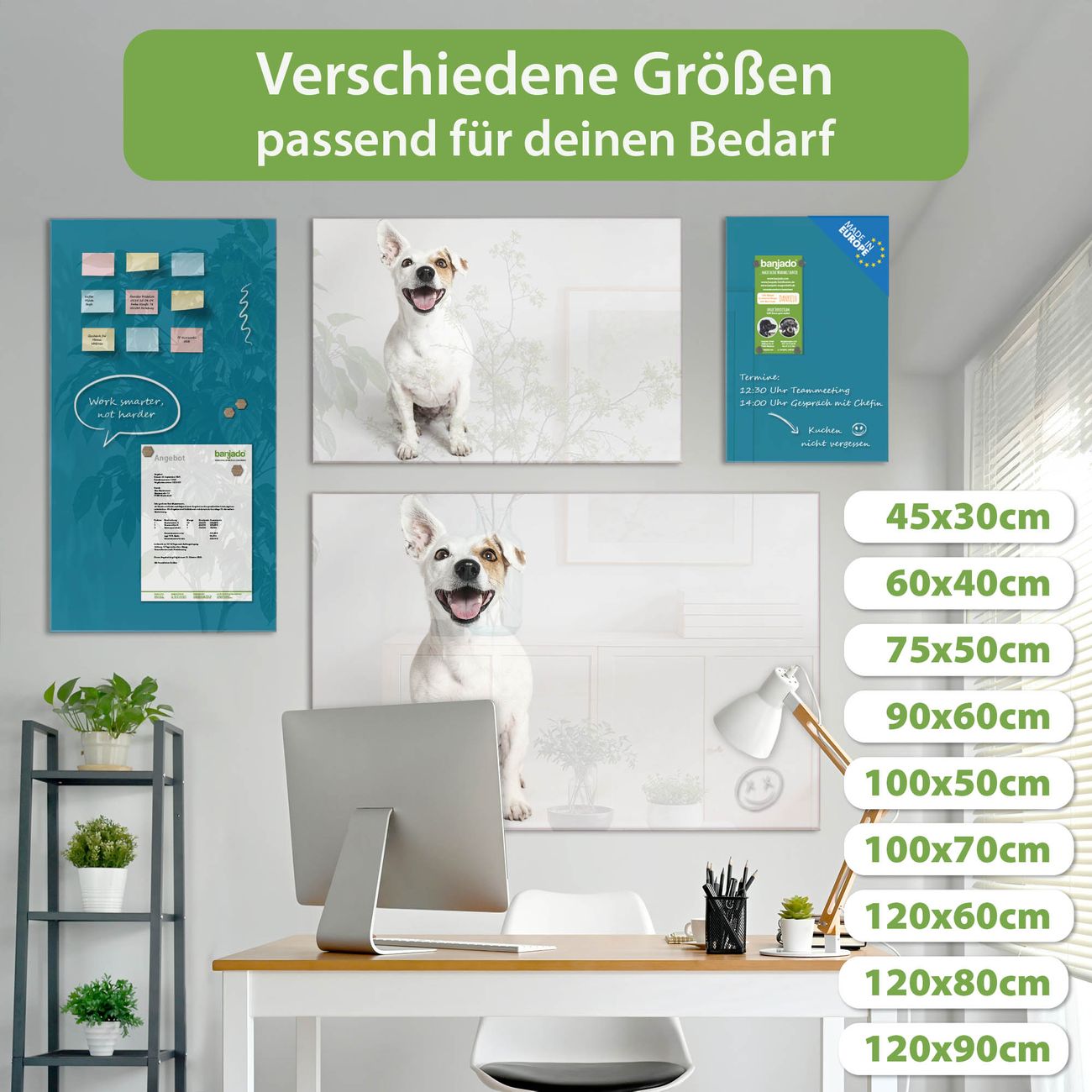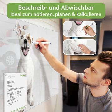 Material: 4mm Sicherheitsglas mit Metallrückwand Eigenschaften: beschreibbar, magnetisch, kratzfest Maße: 45x30x0,6cm, 2,03kg schwer Motiv Nummer 12383 Derek Zubehör: inklusive 4 Neodym-Magnete