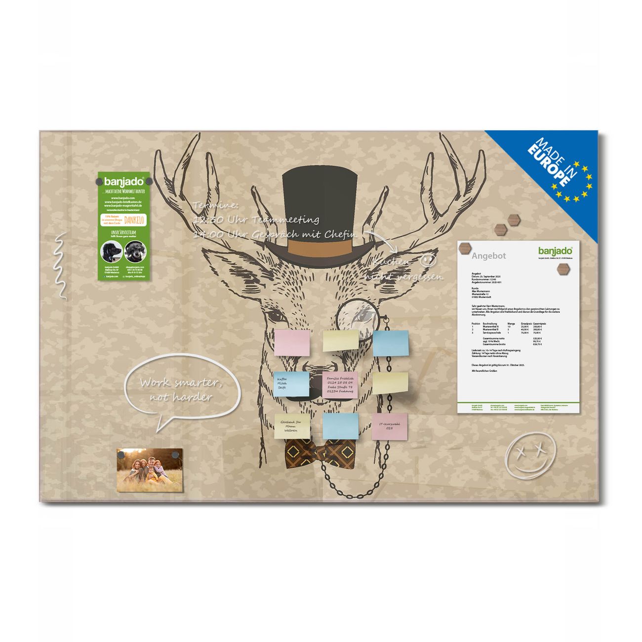 Ein Stück Design, das Ihren Alltag organisiert. Schreiben, heften, inspirieren - alles an einem Ort. Qualität, die man spürt. Montage leicht gemacht. Handwerk mit Herz - veredelt in Sachsen. Einzigartiges Design mit Motiv Motiv Direktor Hirsch Beschreibbare Glasoberfläche, leicht zu reinigen Starke Magnetkraft durch Stahlrückwand Inklusive 4 Neodym-Magneten Flexible Montageoptionen Handveredelt in Sachsen - Qualität, die bleibt