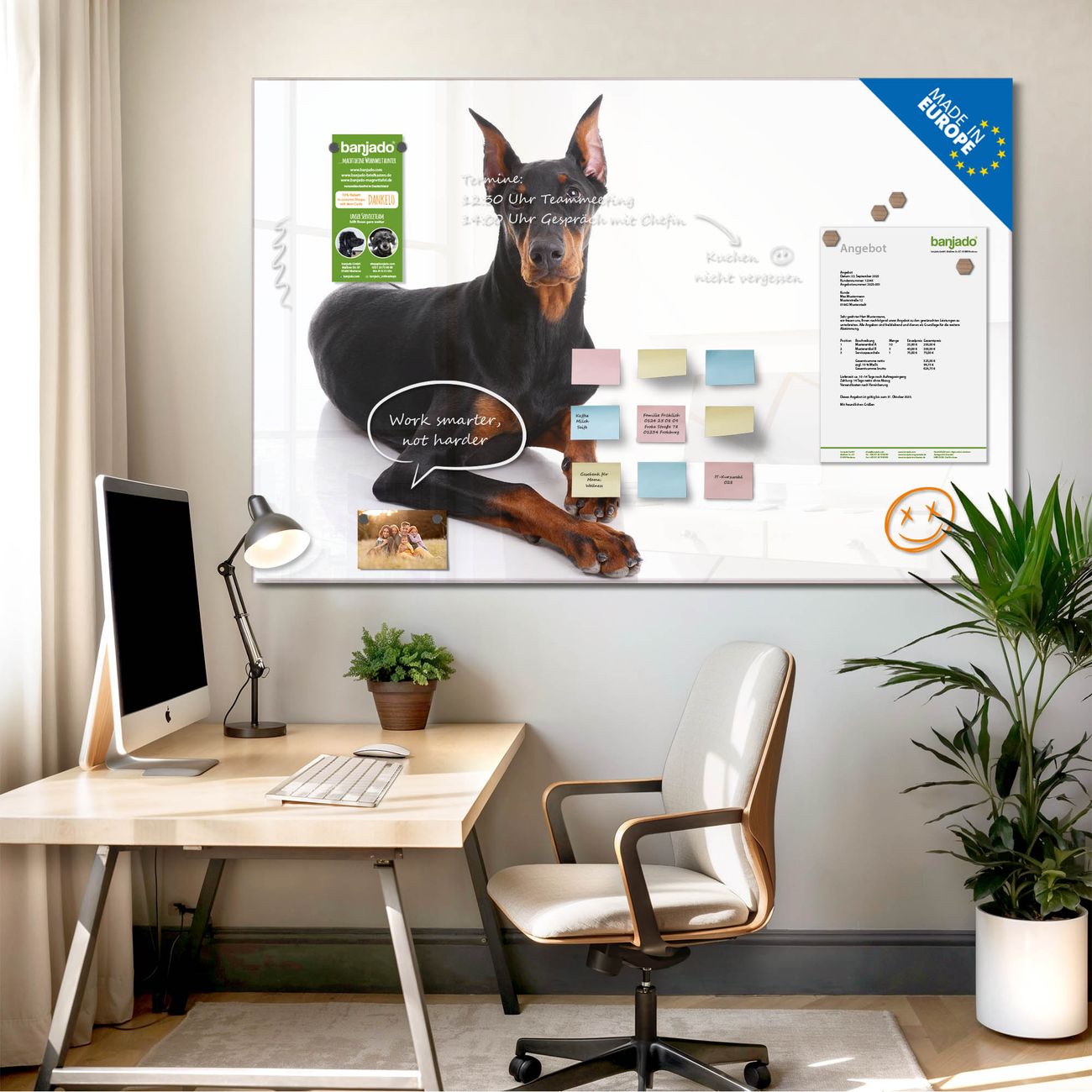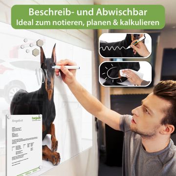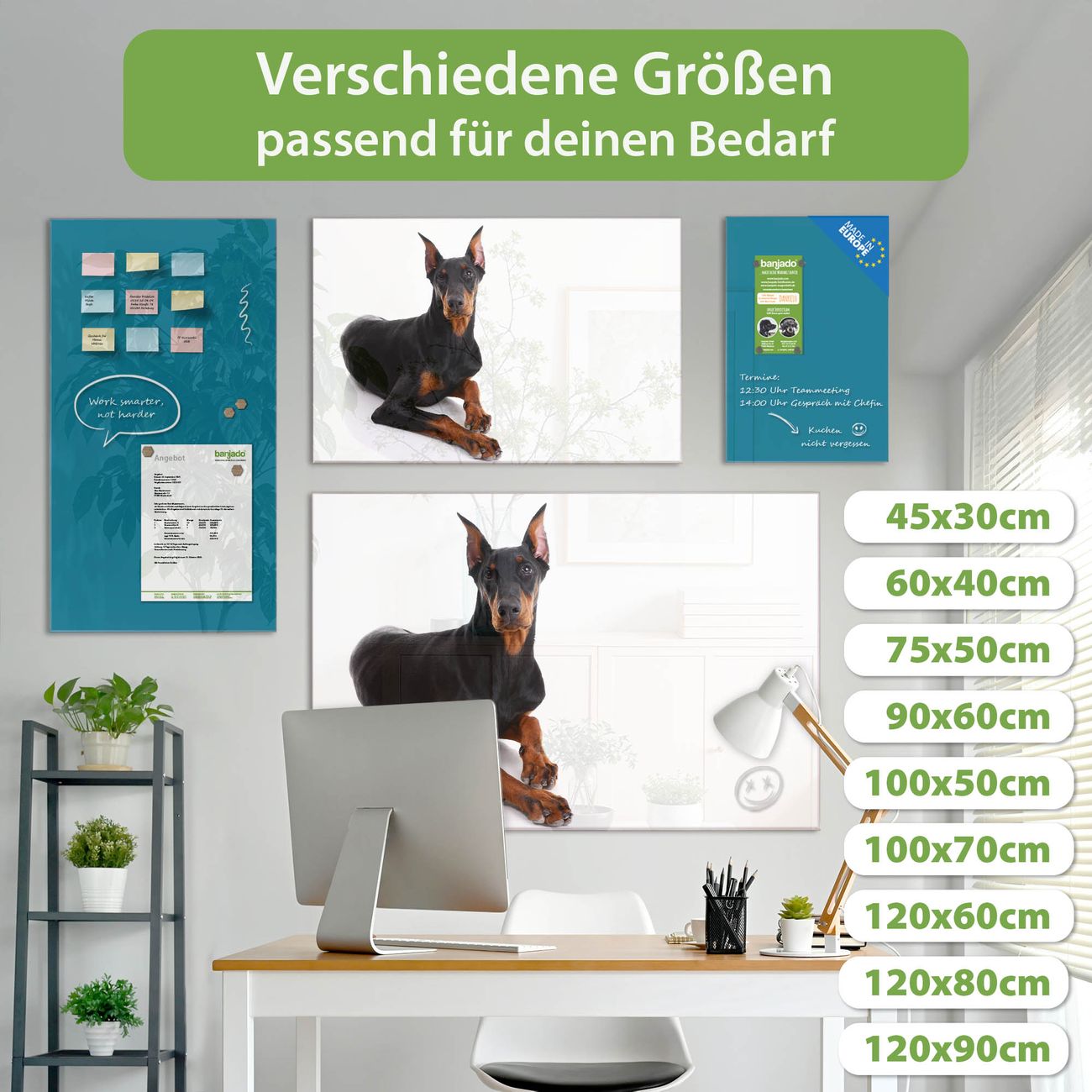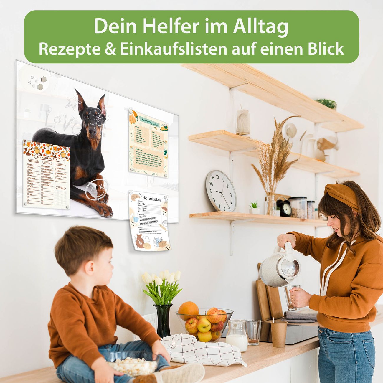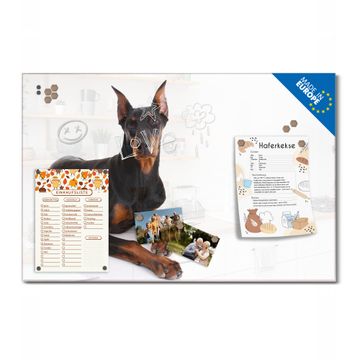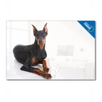 Material: 4mm Sicherheitsglas mit Metallrückwand Eigenschaften: beschreibbar, magnetisch, kratzfest Maße: 75x50x0,6cm, 5,63kg schwer Motiv Nummer 10067 Dobermann Zubehör: inklusive 4 Neodym-Magnete
