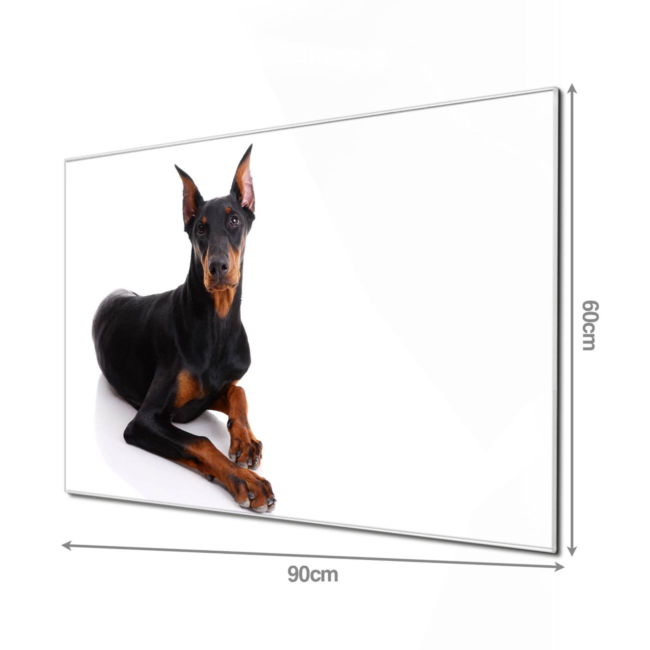 Material: 4mm Sicherheitsglas mit Metallrückwand Eigenschaften: beschreibbar, magnetisch, kratzfest Maße: 90x60x0,6cm, 8,10kg schwer Motiv Nummer 10067 Dobermann Zubehör: inklusive 4 Neodym-Magnete