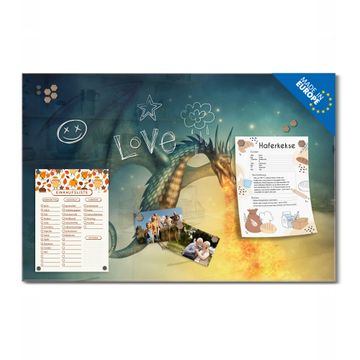 Material: 4mm Sicherheitsglas mit Metallrückwand Eigenschaften: beschreibbar, magnetisch, kratzfest Maße: 45x30x0,6cm, 2,03kg schwer Motiv Nummer 10527 Drachen Zubehör: inklusive 4 Neodym-Magnete