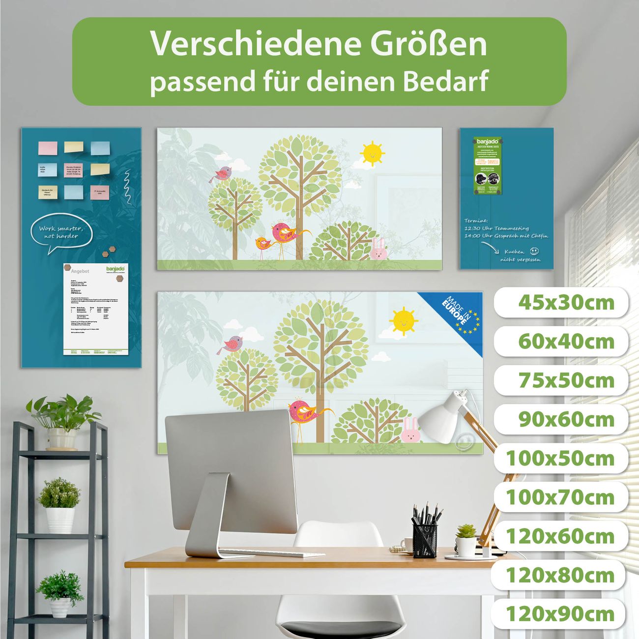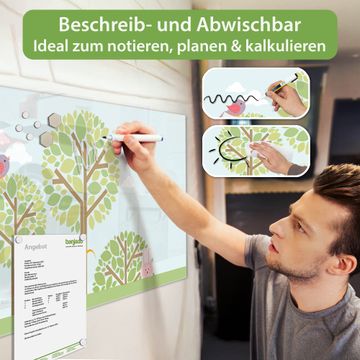 Material: 4mm Sicherheitsglas mit Metallrückwand Eigenschaften: beschreibbar, magnetisch, kratzfest Maße: 120x60x0,6cm, 10,80kg schwer Motiv Nummer 11774 Drei Bäume Zubehör: inklusive 4 Neodym-Magnete