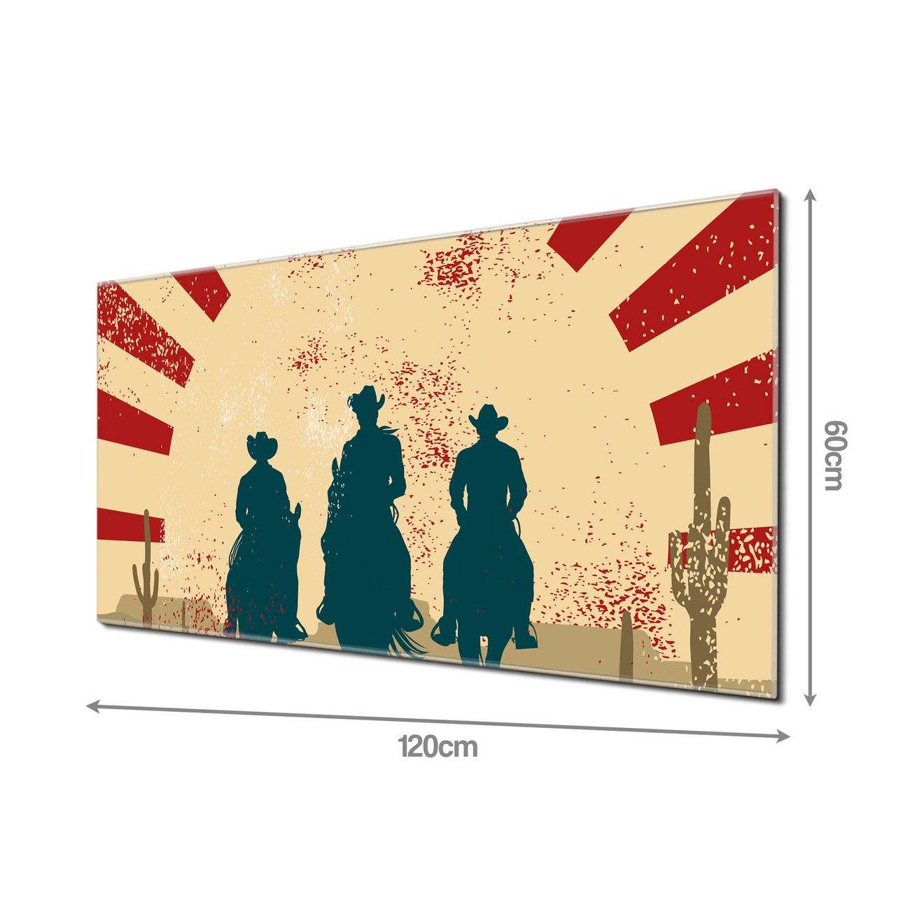 Material: 4mm Sicherheitsglas mit Metallrückwand Eigenschaften: beschreibbar, magnetisch, kratzfest Maße: 120x60x0,6cm, 10,80kg schwer Motiv Nummer 10975 Drei Cowboys Zubehör: inklusive 4 Neodym-Magnete
