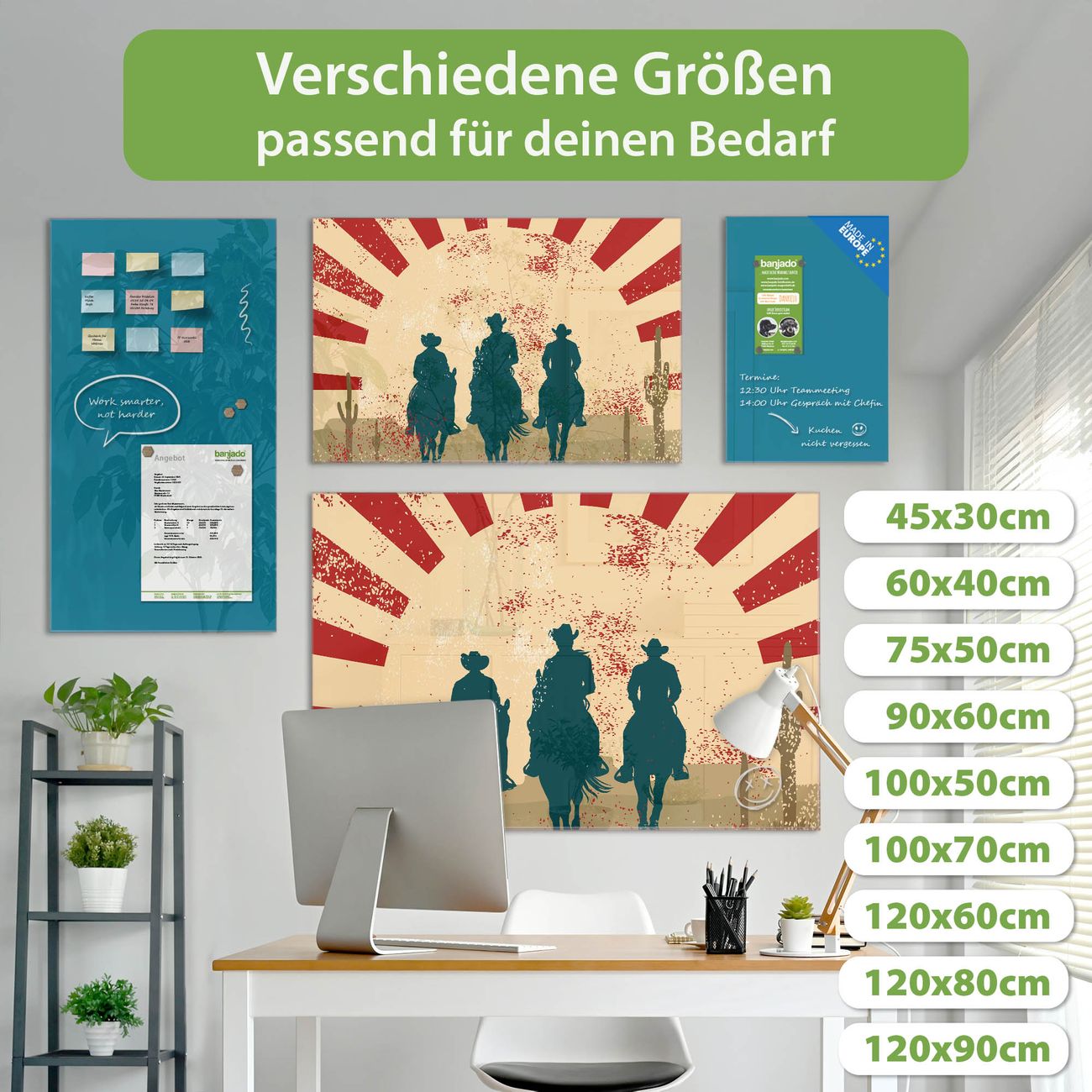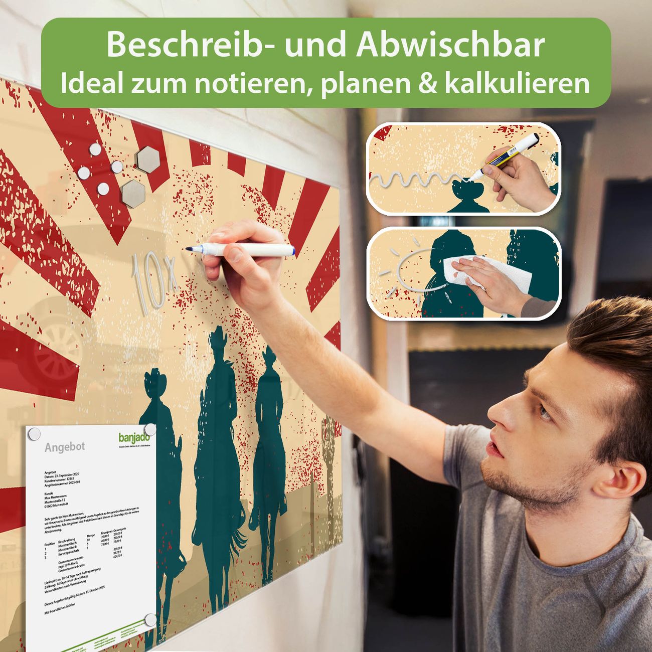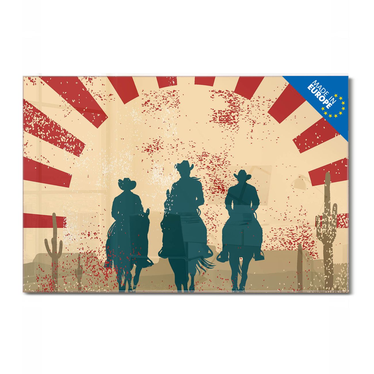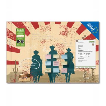 Material: 4mm Sicherheitsglas mit Metallrückwand Eigenschaften: beschreibbar, magnetisch, kratzfest Maße: 120x80x0,6cm, 14,40kg schwer Motiv Nummer 10975 Drei Cowboys Zubehör: inklusive 4 Neodym-Magnete