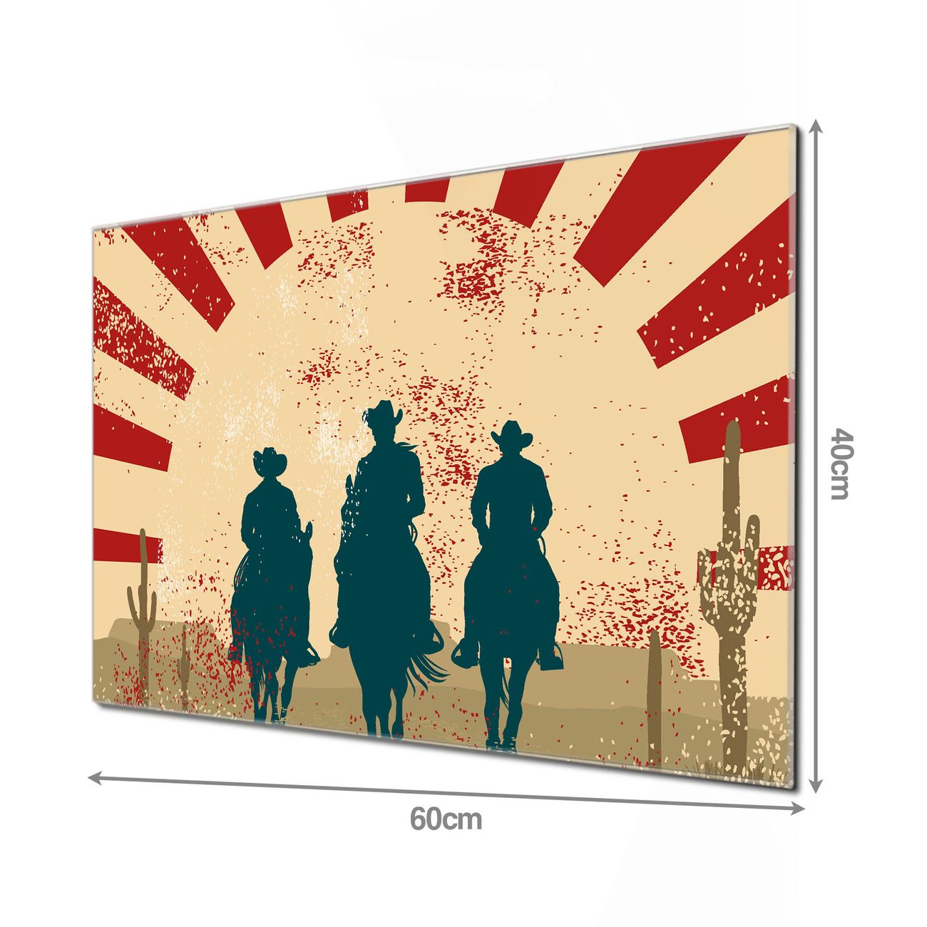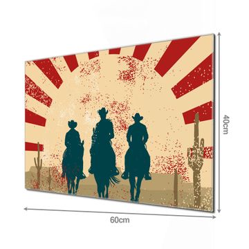 Material  4mm Sicherheitsglas mit Metallrückwand Eigenschaften  beschreibbar, magnetisch, kratzfest Maße  60x40x0,6cm, 3,6kg schwer Motiv  Nummer 10975 Drei Cowboys Zubehör  inklusive 4 Neodym-Magnete