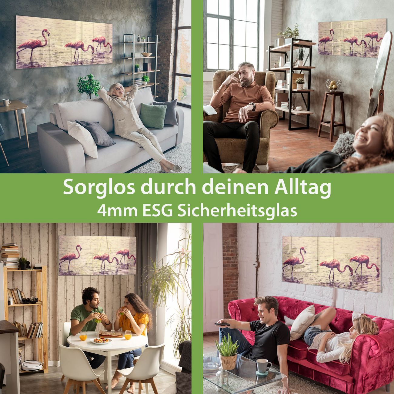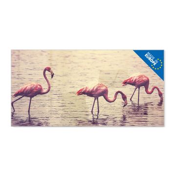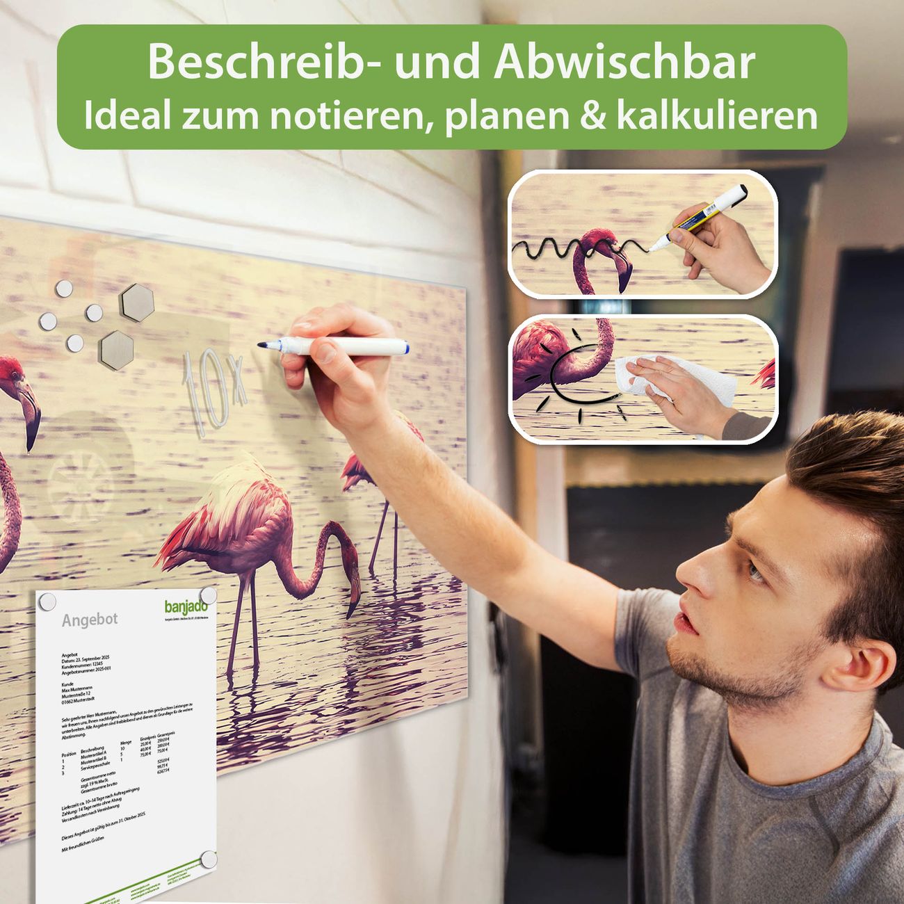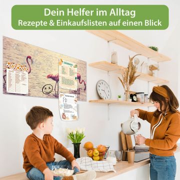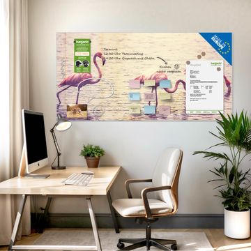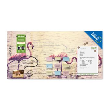 Material: 4mm Sicherheitsglas mit Metallrückwand Eigenschaften: beschreibbar, magnetisch, kratzfest Maße: 100x50x0,6cm, 7,50kg schwer Motiv Nummer 11734 Drei Flamnigos Zubehör: inklusive 4 Neodym-Magnete