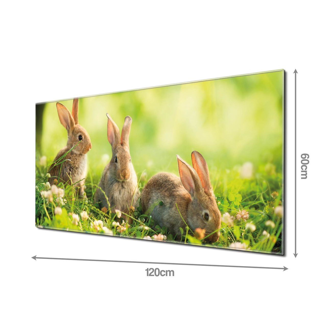 Material: 4mm Sicherheitsglas mit Metallrückwand Eigenschaften: beschreibbar, magnetisch, kratzfest Maße: 120x60x0,6cm, 10,80kg schwer Motiv Nummer 11125 Drei Hasen Zubehör: inklusive 4 Neodym-Magnete
