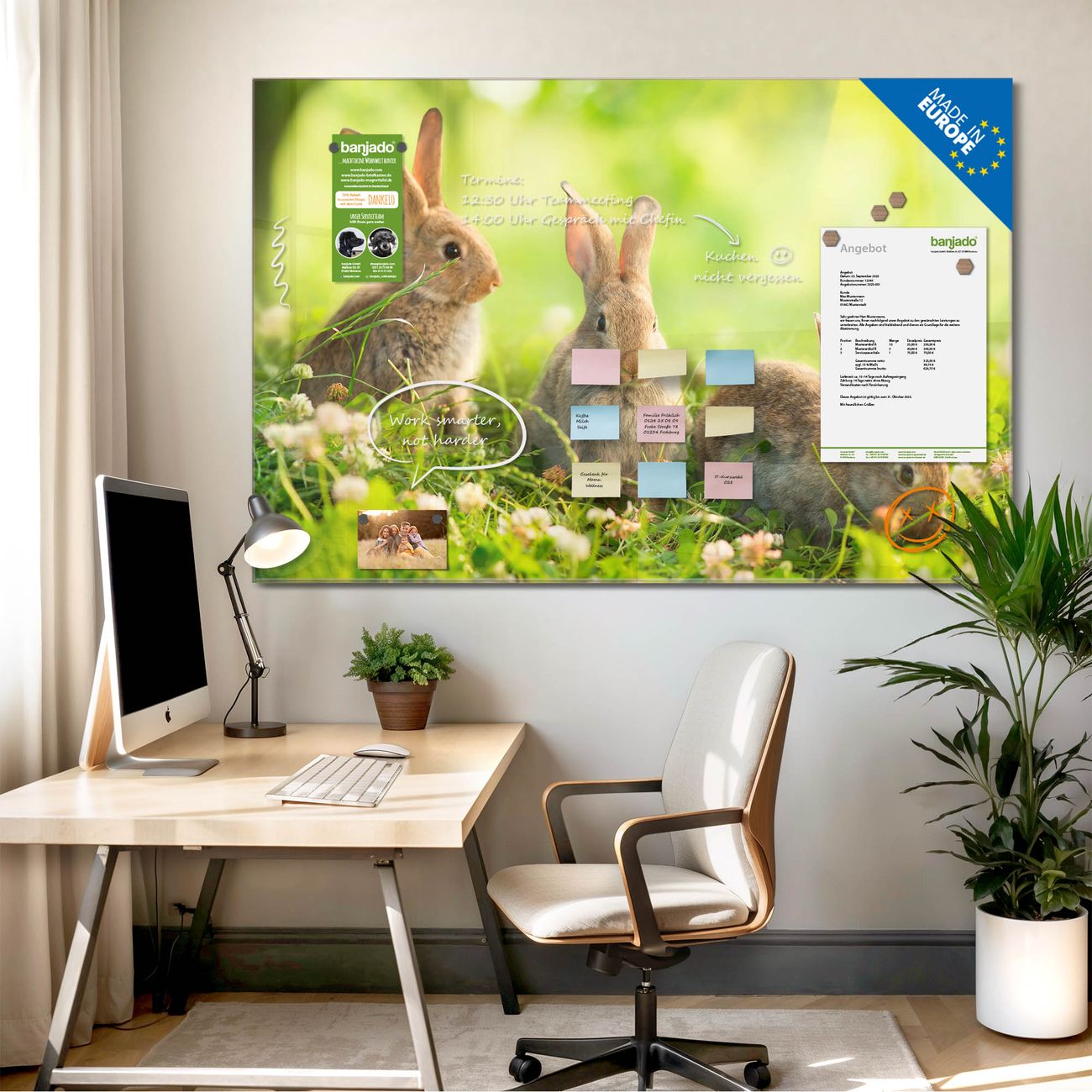 Die banjado Glas Magnettafel mit dem Motiv Motiv Drei Hasen verbindet Funktionalität mit Stil. Sie ersetzt das Zettelchaos durch klare Strukturen und bringt dabei eine warme, natürliche Atmosphäre in Ihr Zuhause. Ob im Büro, in der Küche oder im Eingangsbereich - dieses Design-Board zieht Blicke an und sorgt für Ordnung mit Charakter.