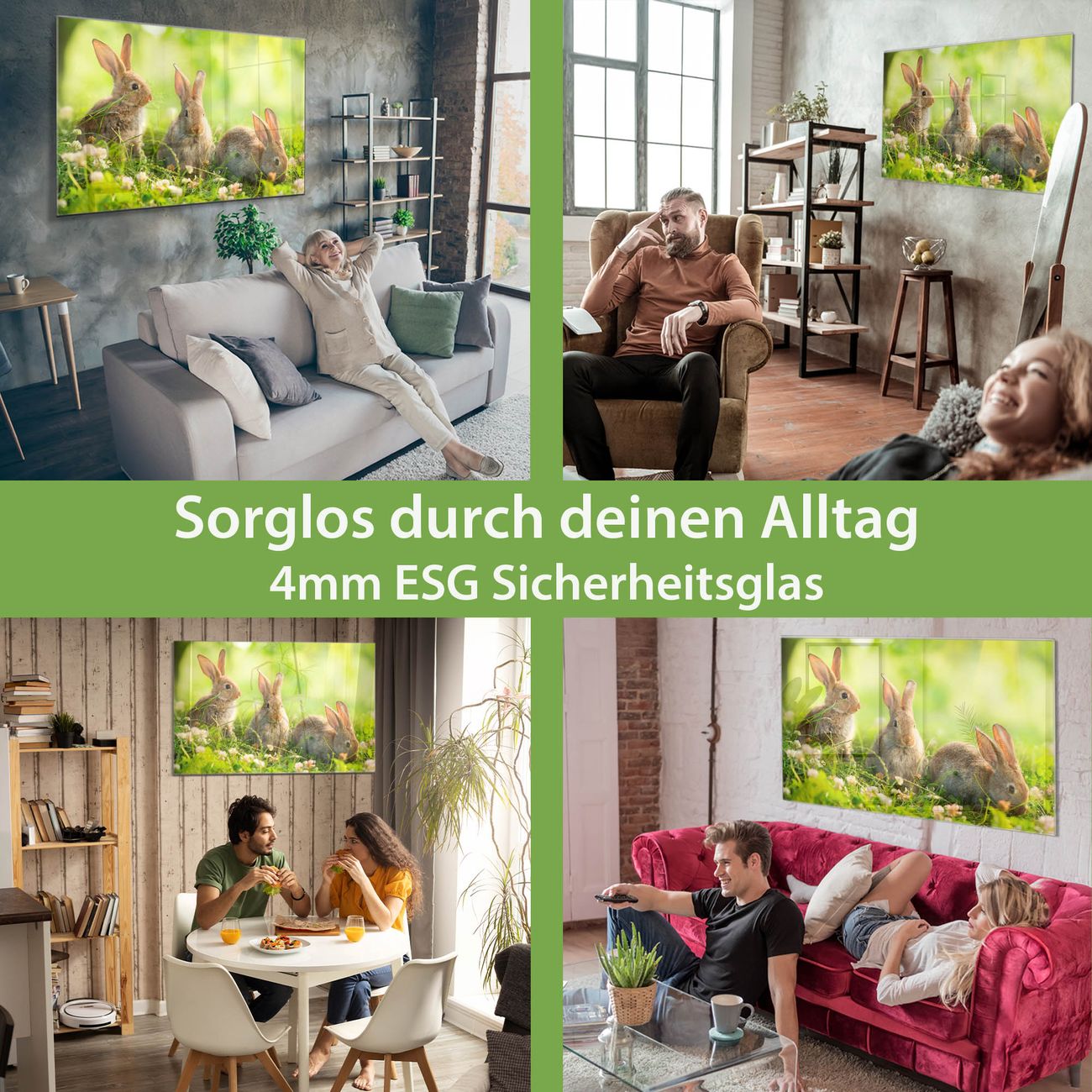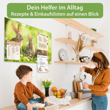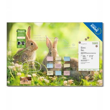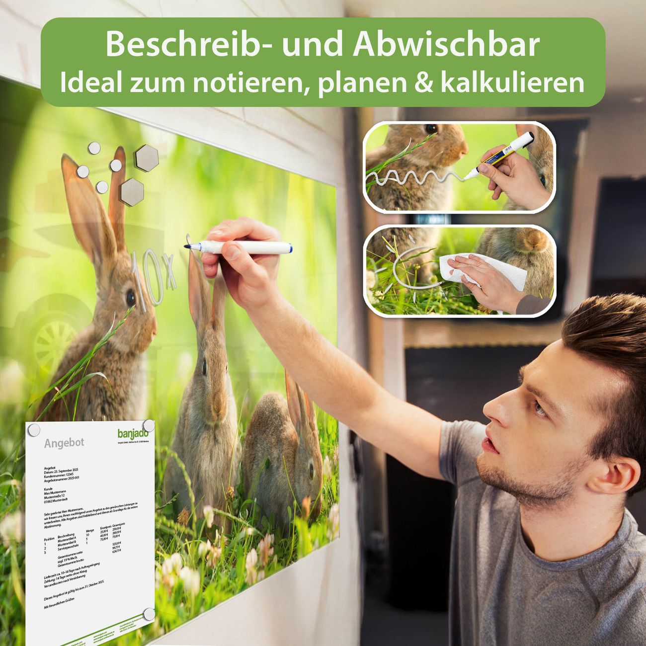 Material: 4mm Sicherheitsglas mit Metallrückwand Eigenschaften: beschreibbar, magnetisch, kratzfest Maße: 120x80x0,6cm, 14,40kg schwer Motiv Nummer 11125 Drei Hasen Zubehör: inklusive 4 Neodym-Magnete