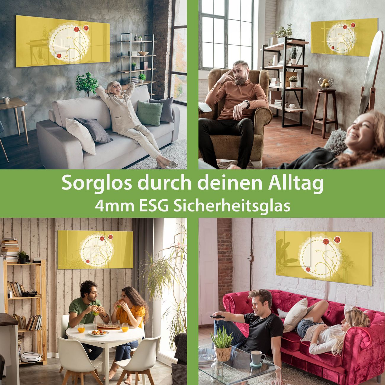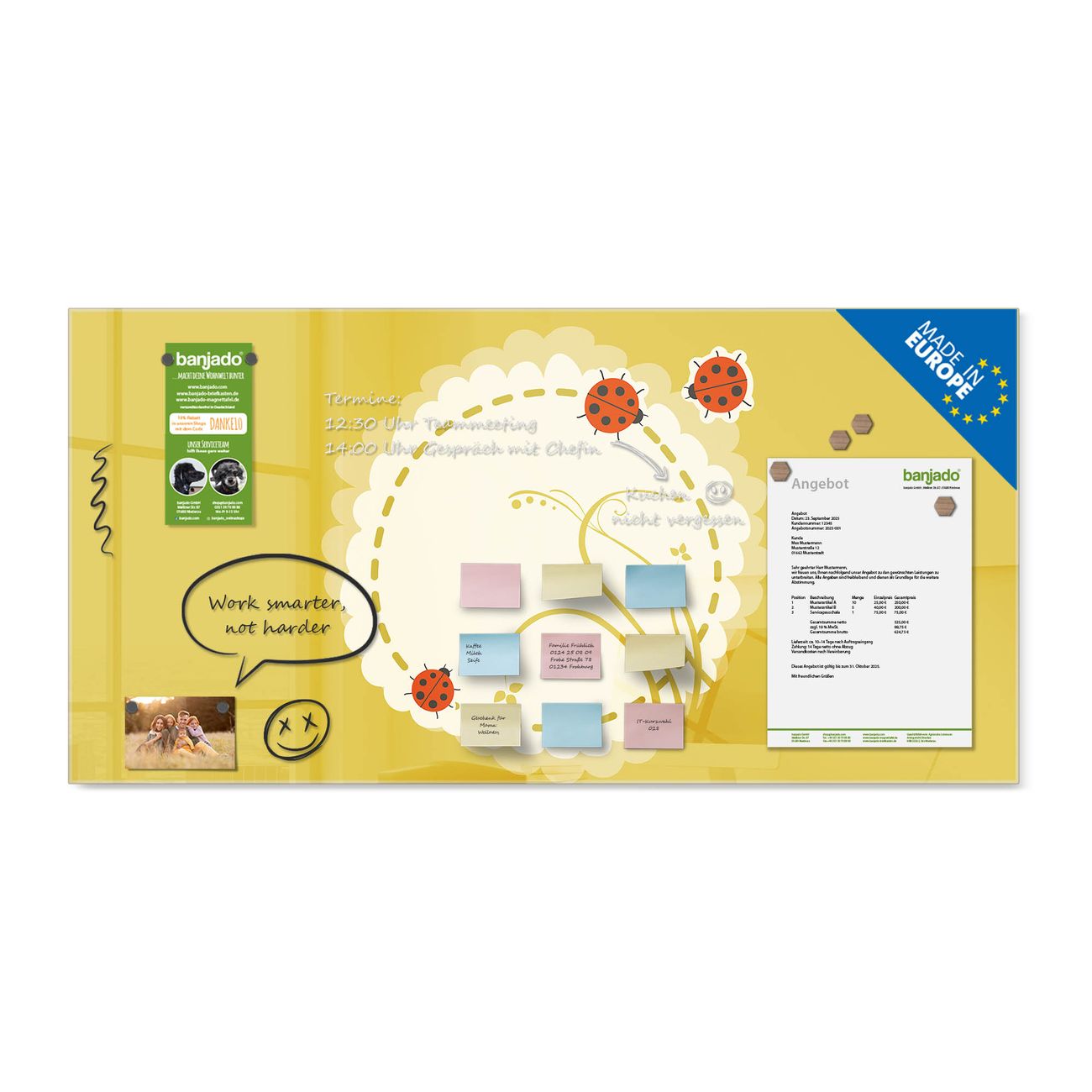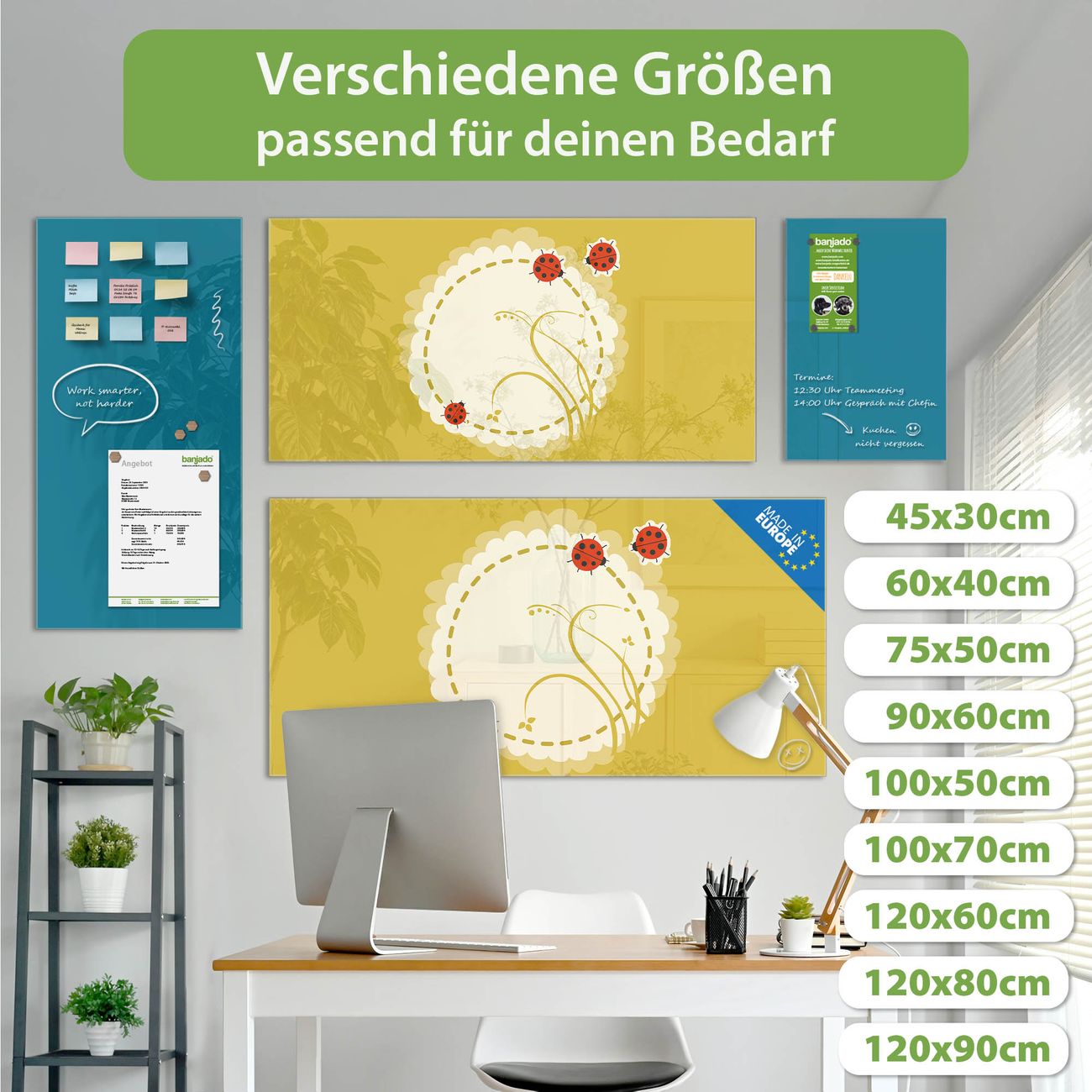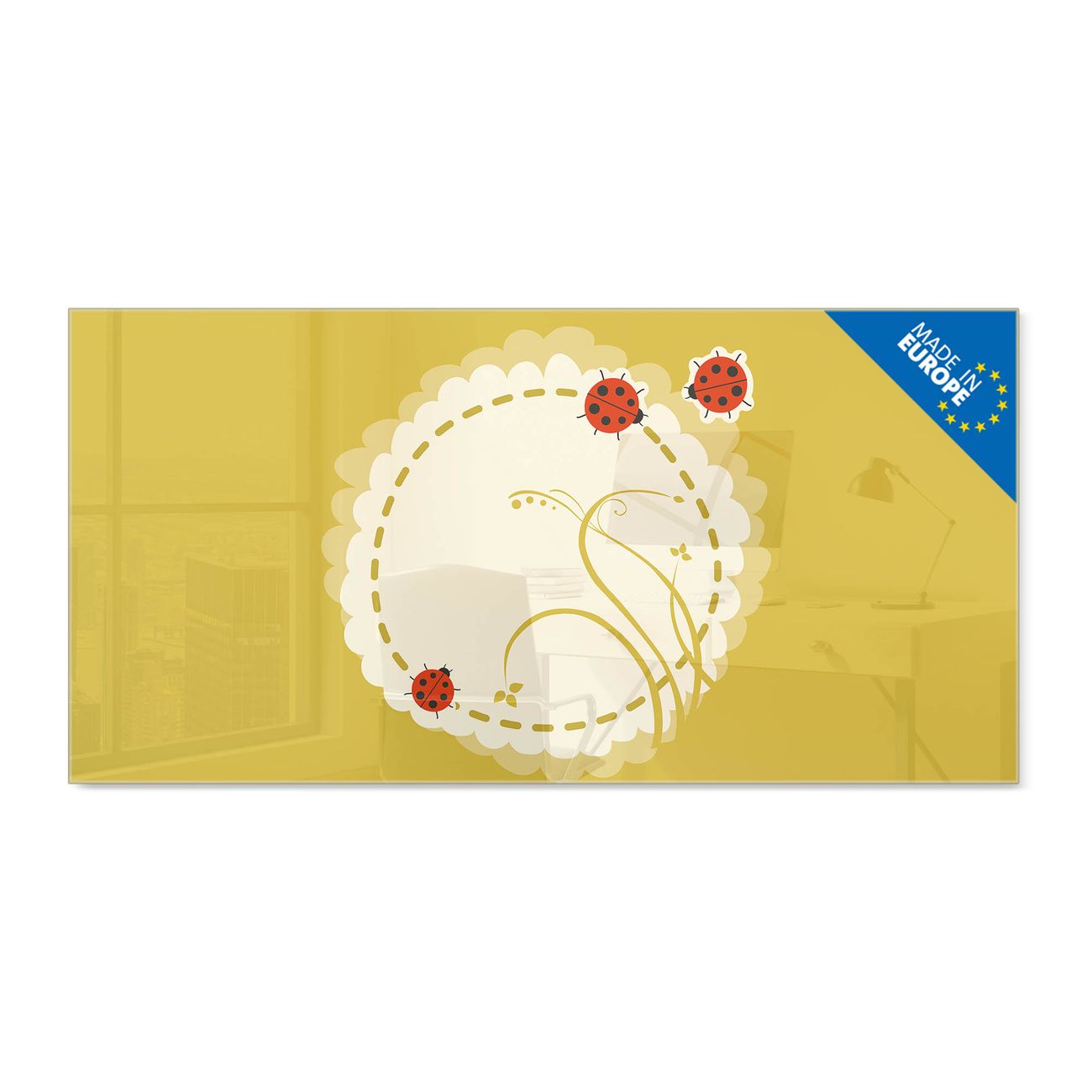 Material: 4mm Sicherheitsglas mit Metallrückwand Eigenschaften: beschreibbar, magnetisch, kratzfest Maße: 100x50x0,6cm, 7,50kg schwer Motiv Nummer 10945 Drei Marienkäfer Zubehör: inklusive 4 Neodym-Magnete