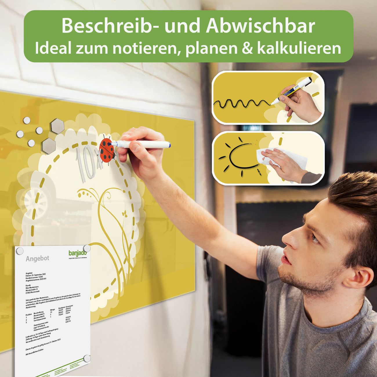 Jede Glas Magnettafel wird in unserer Werkstatt von Hand gefertigt und sorgfältig geprüft. So erhalten Sie ein echtes Qualitätsprodukt, das Funktion und Ästhetik perfekt vereint.?? Warum banjado?