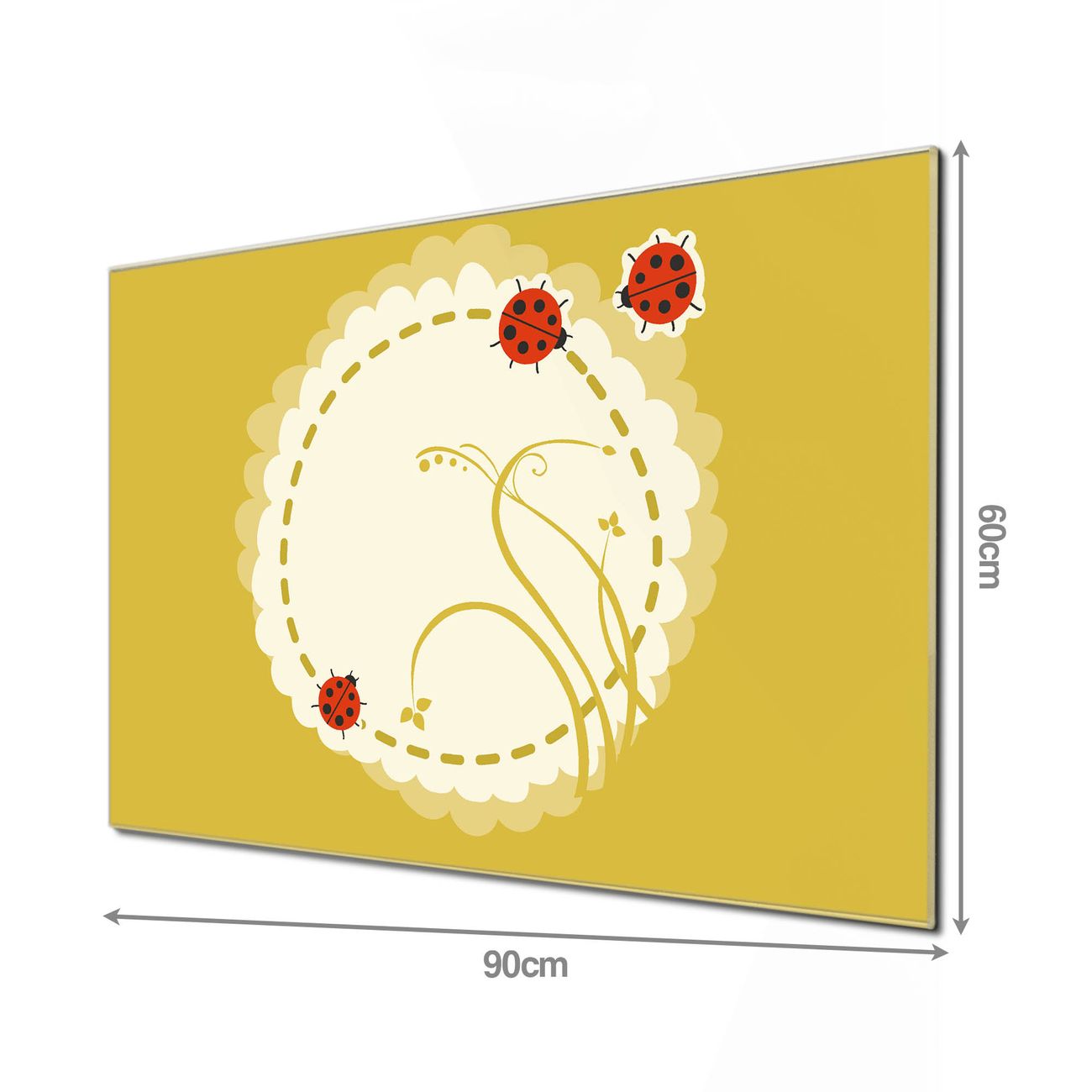 Material: 4mm Sicherheitsglas mit Metallrückwand Eigenschaften: beschreibbar, magnetisch, kratzfest Maße: 90x60x0,6cm, 8,10kg schwer Motiv Nummer 10945 Drei Marienkäfer Zubehör: inklusive 4 Neodym-Magnete