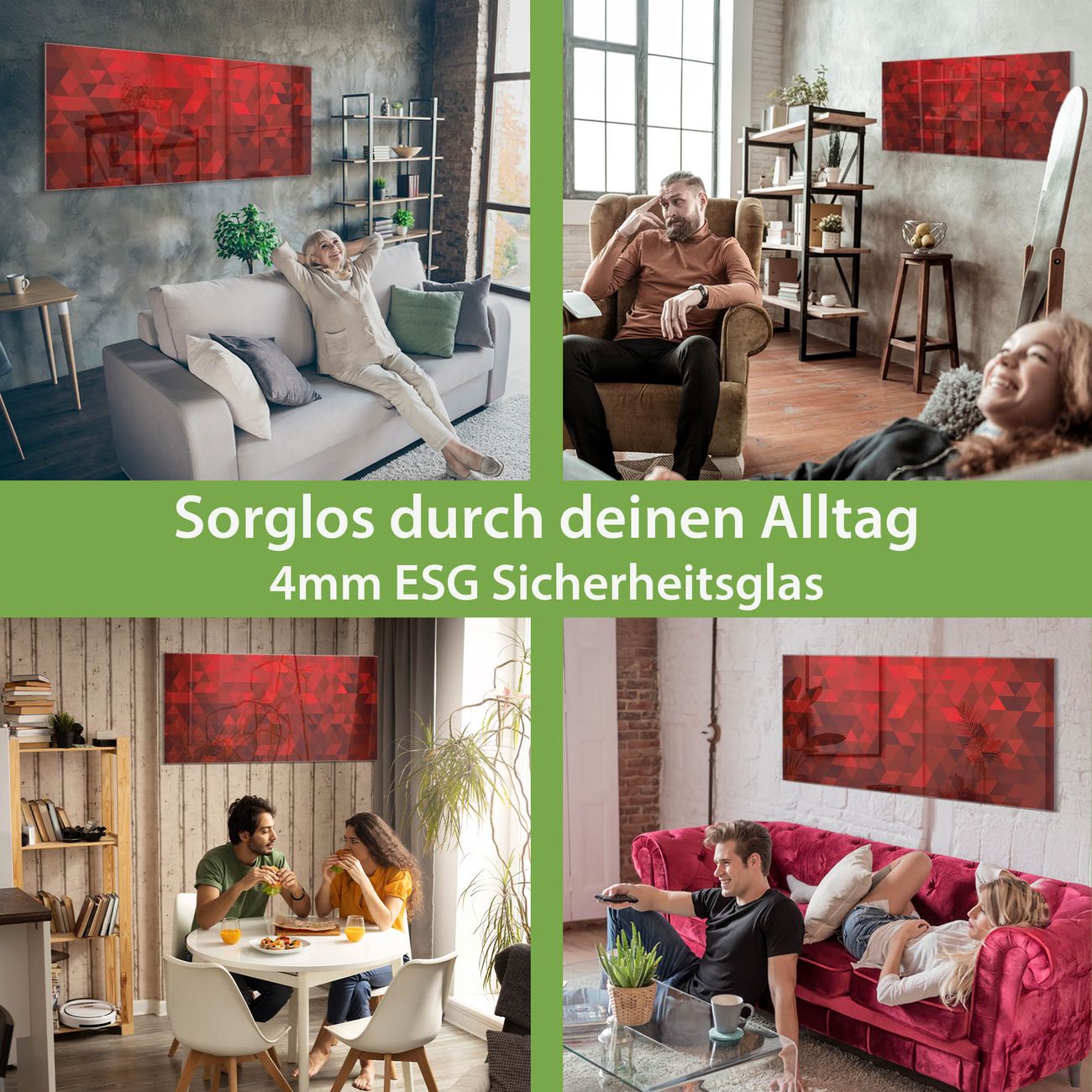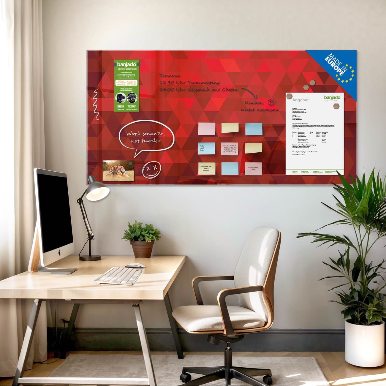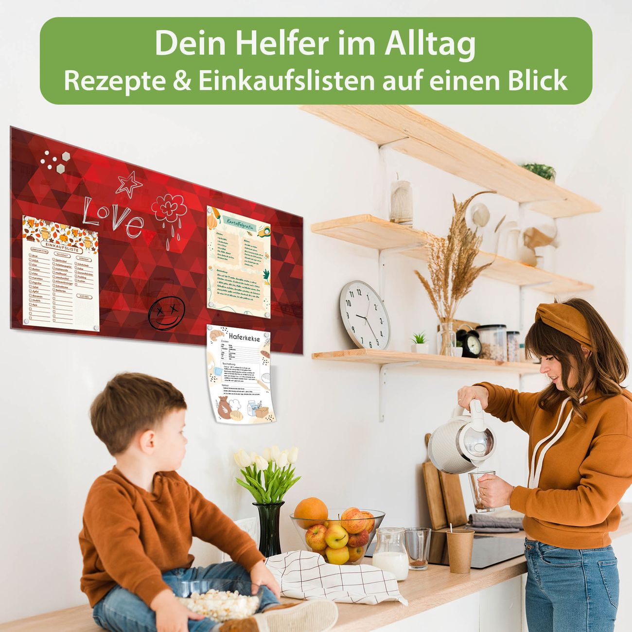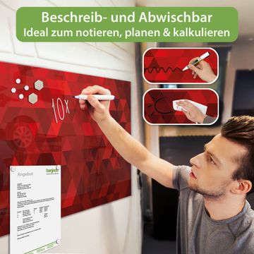 Material: 4mm Sicherheitsglas mit Metallrückwand Eigenschaften: beschreibbar, magnetisch, kratzfest Maße: 100x50x0,6cm, 7,50kg schwer Motiv Nummer 10949 Dreiecke Rot Zubehör: inklusive 4 Neodym-Magnete