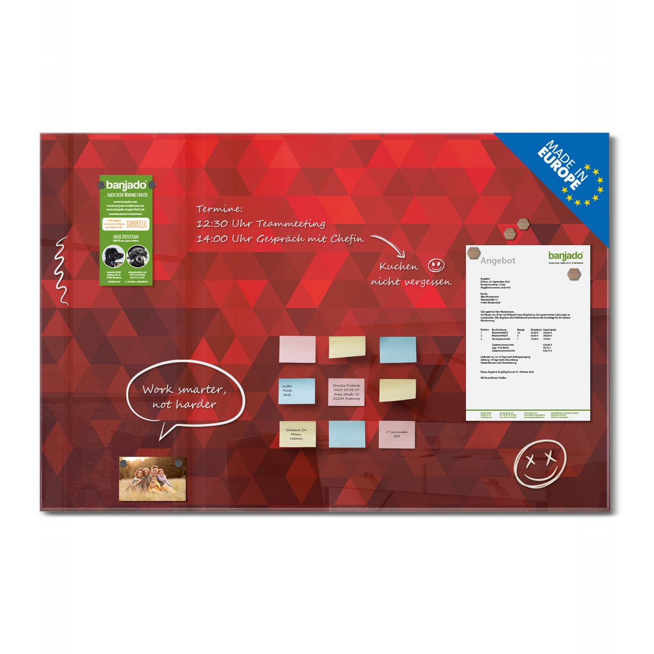 Jede Glas Magnettafel wird in unserer Werkstatt von Hand gefertigt und sorgfältig geprüft. So erhalten Sie ein echtes Qualitätsprodukt, das Funktion und Ästhetik perfekt vereint.?? Warum banjado?
