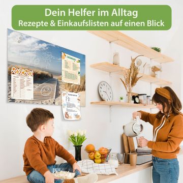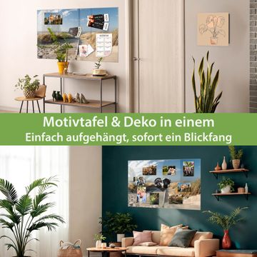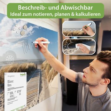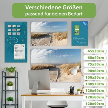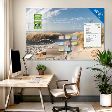 Material: 4mm Sicherheitsglas mit Metallrückwand Eigenschaften: beschreibbar, magnetisch, kratzfest Maße: 75x50x0,6cm, 5,63kg schwer Motiv Nummer 10183 Dünen Zubehör: inklusive 4 Neodym-Magnete