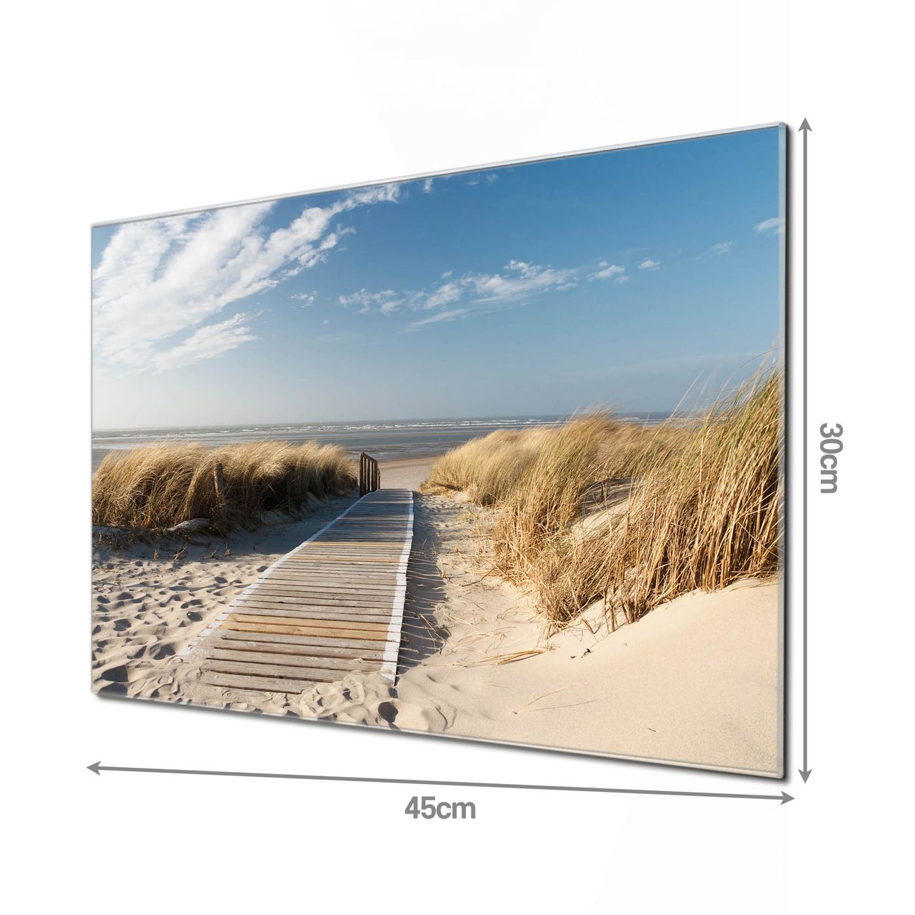 Material: 4mm Sicherheitsglas mit Metallrückwand Eigenschaften: beschreibbar, magnetisch, kratzfest Maße: 45x30x0,6cm, 2,03kg schwer Motiv Nummer 10183 Dünen Zubehör: inklusive 4 Neodym-Magnete