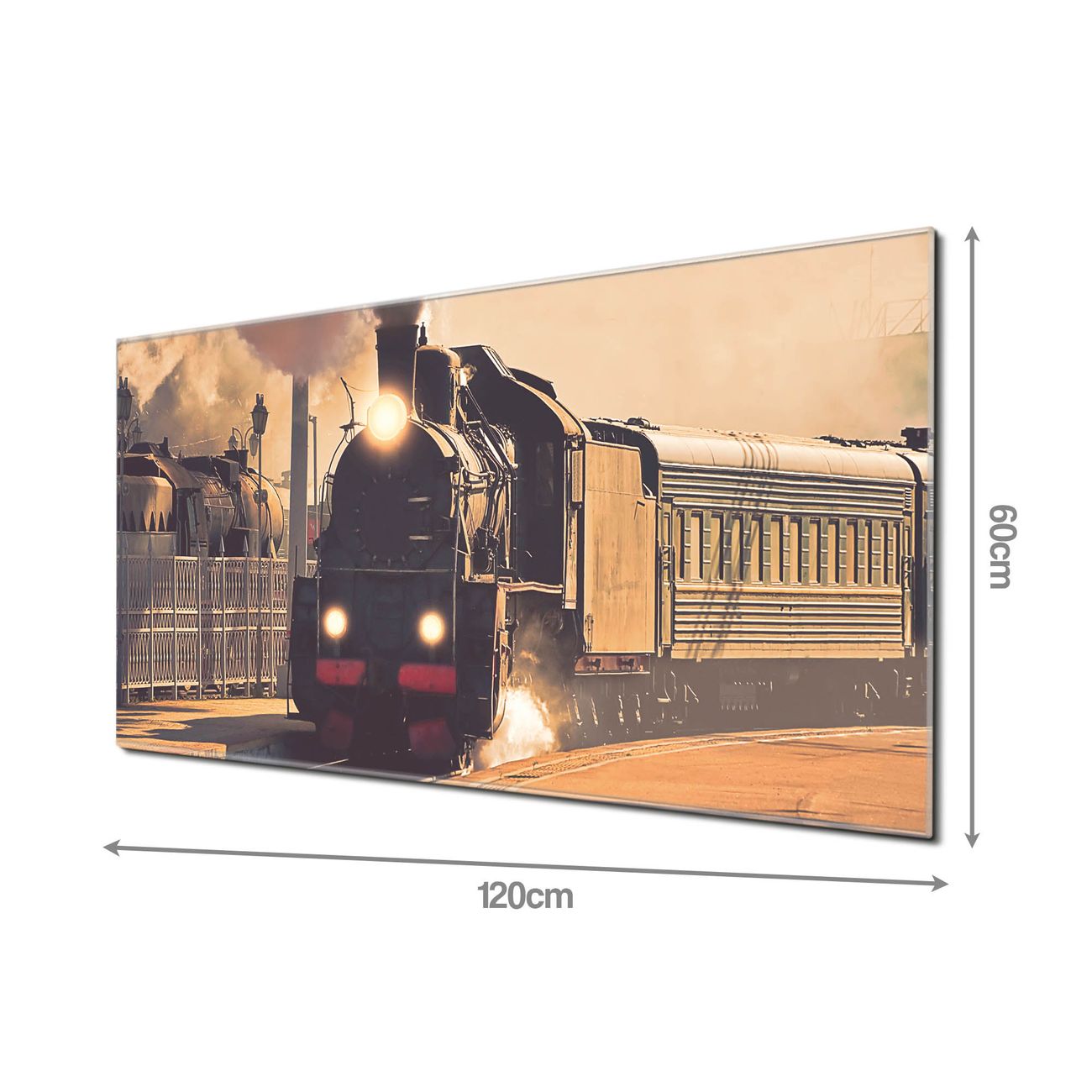 Material: 4mm Sicherheitsglas mit Metallrückwand Eigenschaften: beschreibbar, magnetisch, kratzfest Maße: 120x60x0,6cm, 10,80kg schwer Motiv Nummer 11092 Einfahrender Zug Zubehör: inklusive 4 Neodym-Magnete