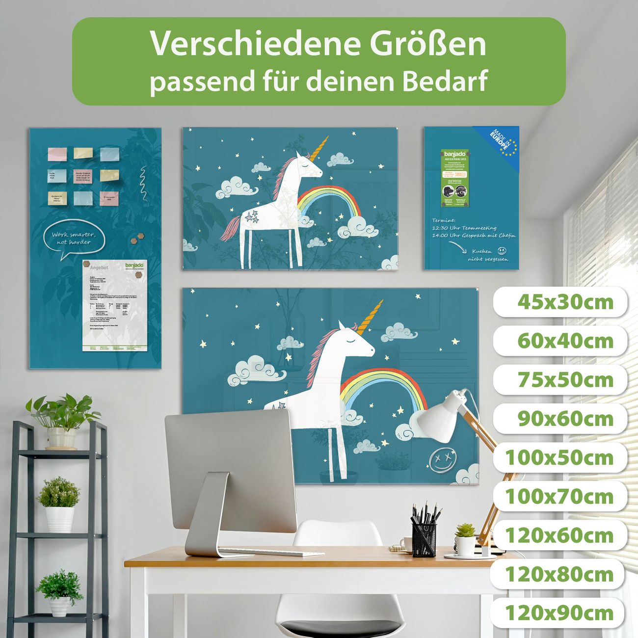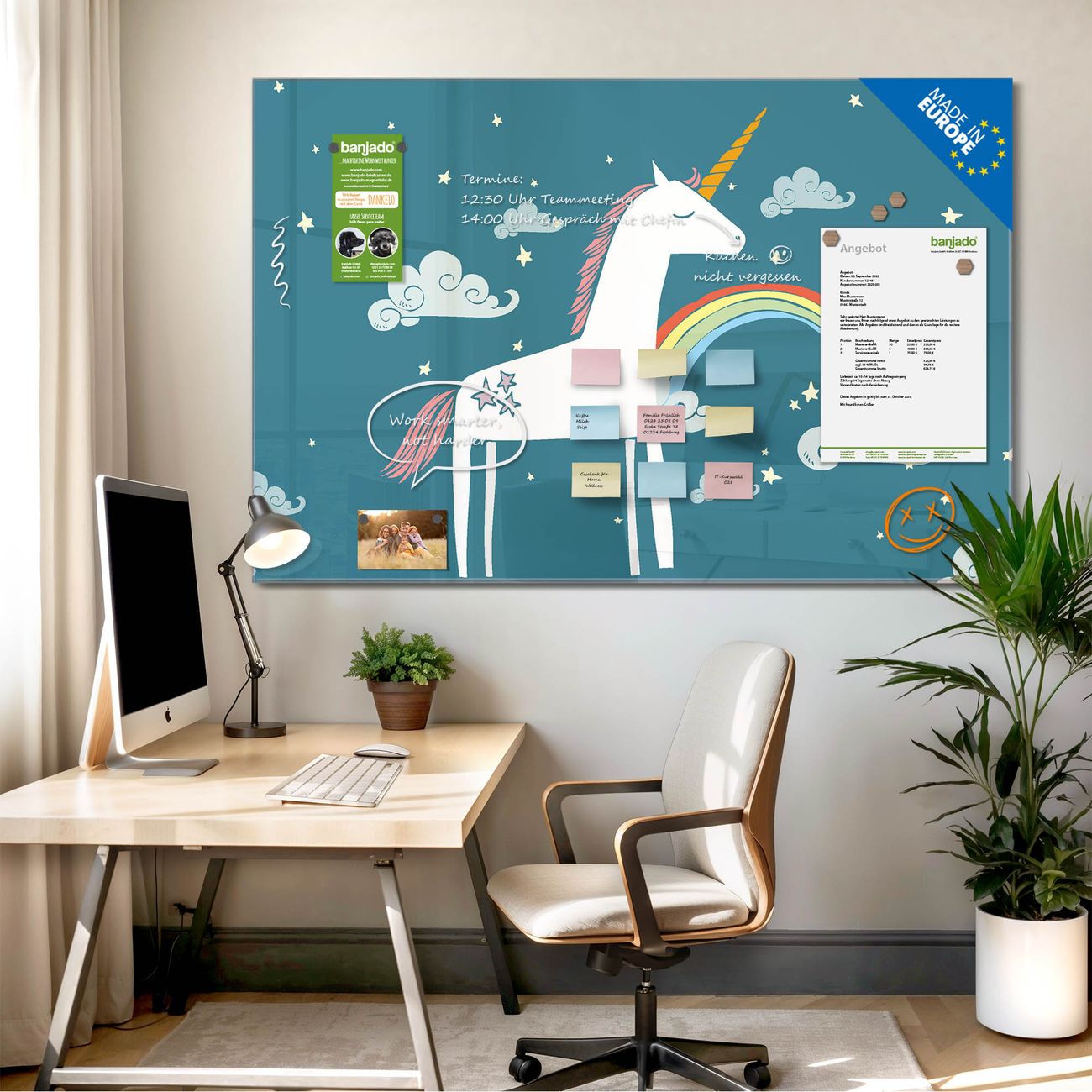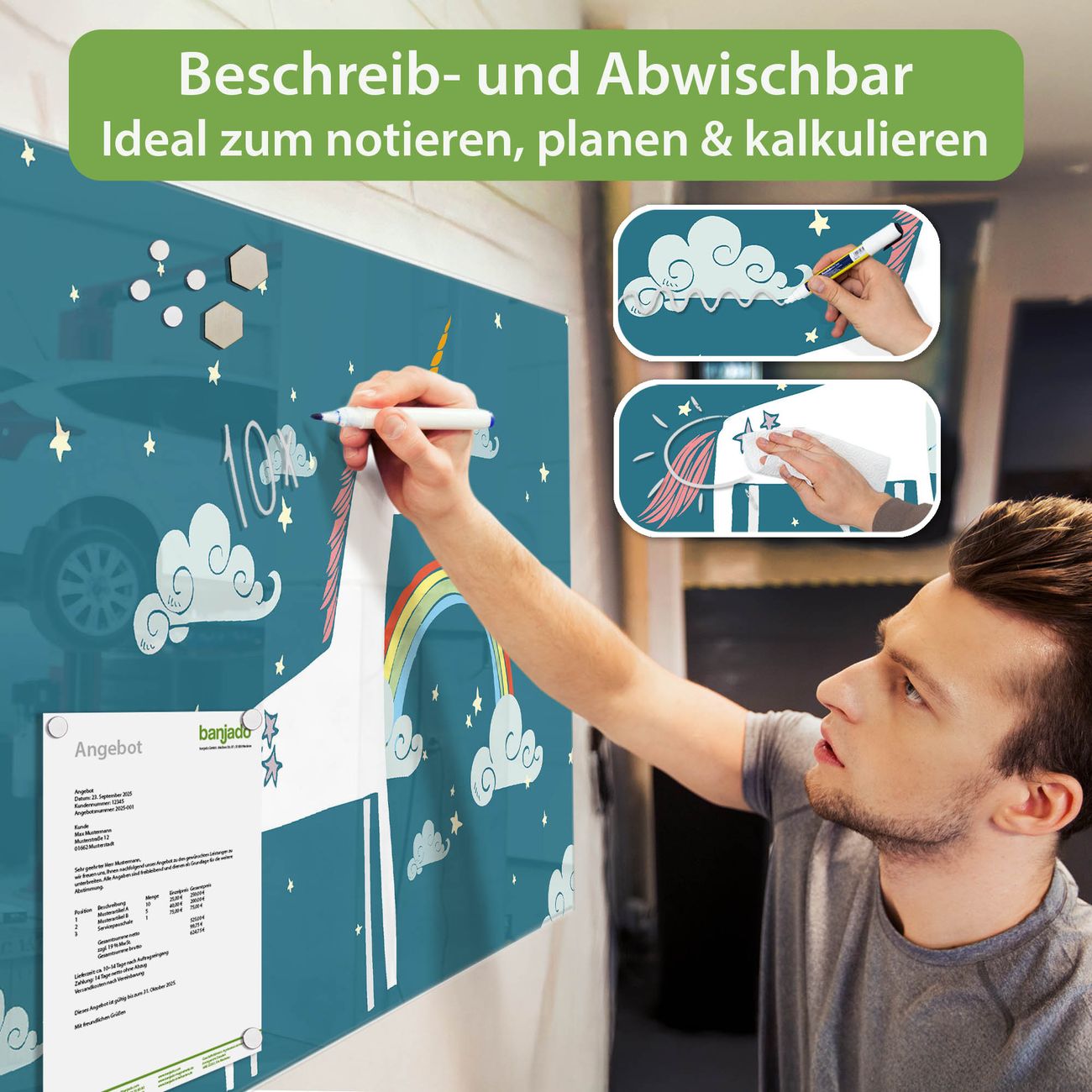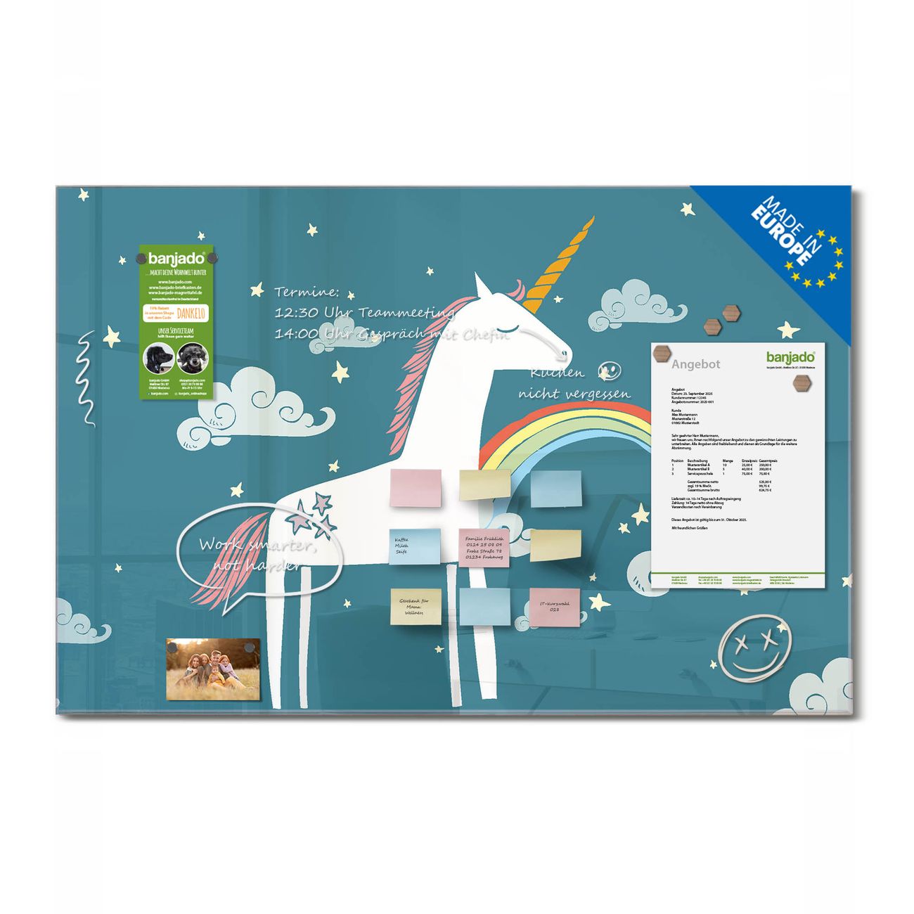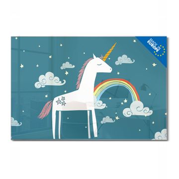 Material: 4mm Sicherheitsglas mit Metallrückwand Eigenschaften: beschreibbar, magnetisch, kratzfest Maße: 120x80x0,6cm, 14,40kg schwer Motiv Nummer 12494 Einhorn Zubehör: inklusive 4 Neodym-Magnete