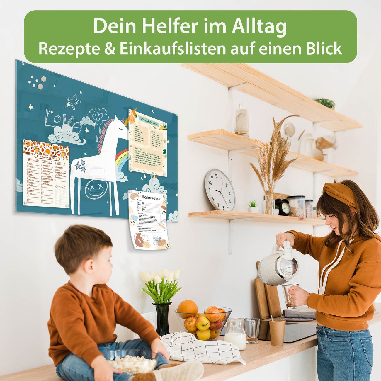Ein Stück Design, das Ihren Alltag organisiert. Schreiben, heften, inspirieren - alles an einem Ort. Qualität, die man spürt. Montage leicht gemacht. Handwerk mit Herz - veredelt in Sachsen. Einzigartiges Design mit Motiv Motiv Einhorn Beschreibbare Glasoberfläche, leicht zu reinigen Starke Magnetkraft durch Stahlrückwand Inklusive 4 Neodym-Magneten Flexible Montageoptionen Handveredelt in Sachsen - Qualität, die bleibt