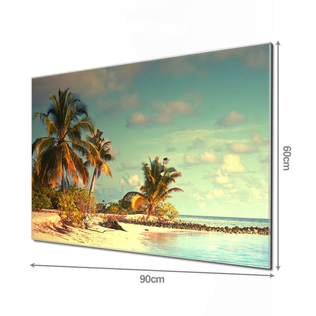 Material: 4mm Sicherheitsglas mit Metallrückwand Eigenschaften: beschreibbar, magnetisch, kratzfest Maße: 90x60x0,6cm, 8,10kg schwer Motiv Nummer 11723 Einsame Insel Zubehör: inklusive 4 Neodym-Magnete