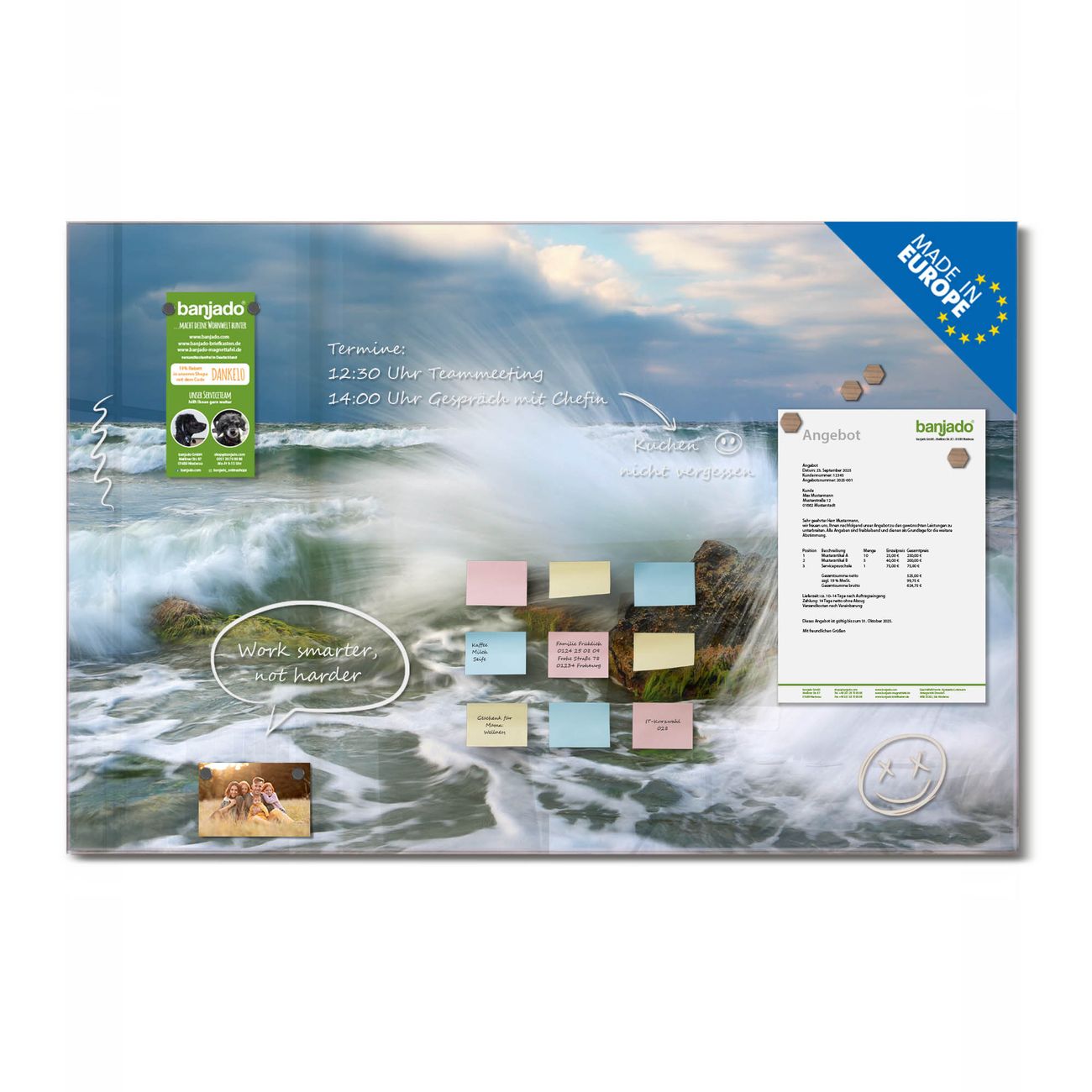 Material: 4mm Sicherheitsglas mit Metallrückwand Eigenschaften: beschreibbar, magnetisch, kratzfest Maße: 120x80x0,6cm, 14,40kg schwer Motiv Nummer 12255 Einsteinwelle Zubehör: inklusive 4 Neodym-Magnete