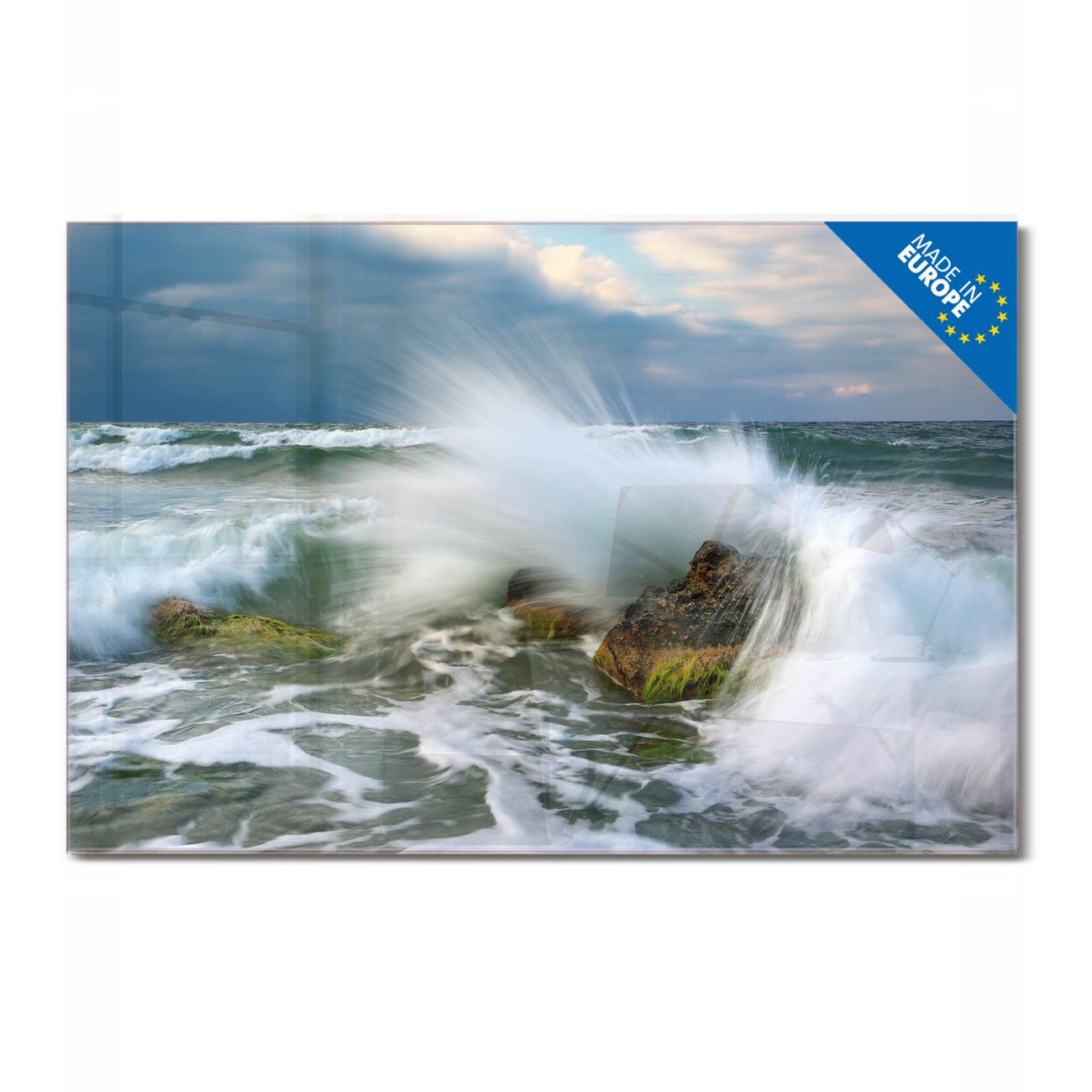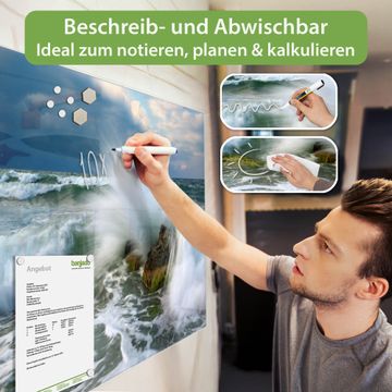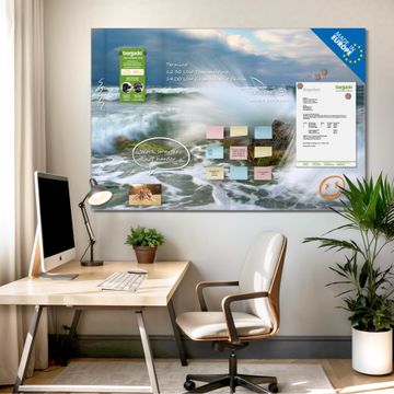 Material: 4mm Sicherheitsglas mit Metallrückwand Eigenschaften: beschreibbar, magnetisch, kratzfest Maße: 75x50x0,6cm, 5,63kg schwer Motiv Nummer 12255 Einsteinwelle Zubehör: inklusive 4 Neodym-Magnete