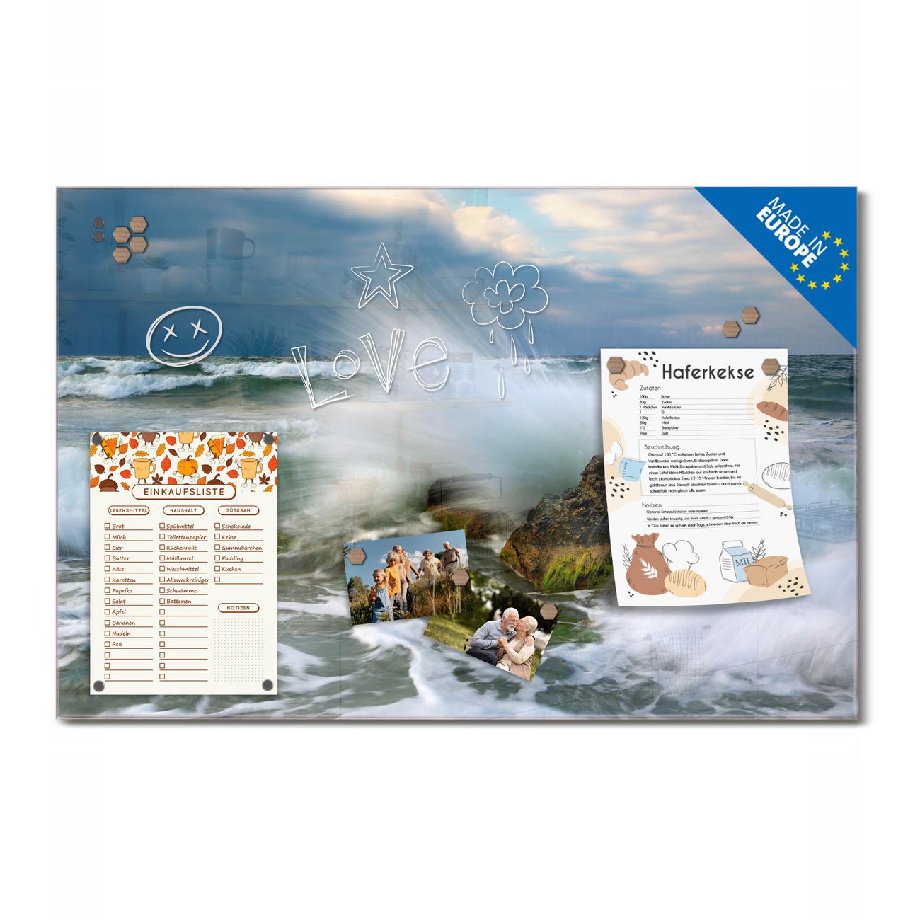 Auf der glatten Glasoberfläche lassen sich Termine, Rezepte oder Notizen ganz einfach mit Kreidestiften festhalten und rückstandslos entfernen. Starke Neodym-Magnete halten Ihre wichtigsten Erinnerungen sicher an Ort und Stelle. So entsteht Ihre ganz persönliche Ideenwand - jeden Tag neu.