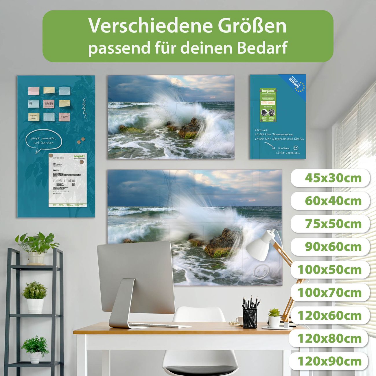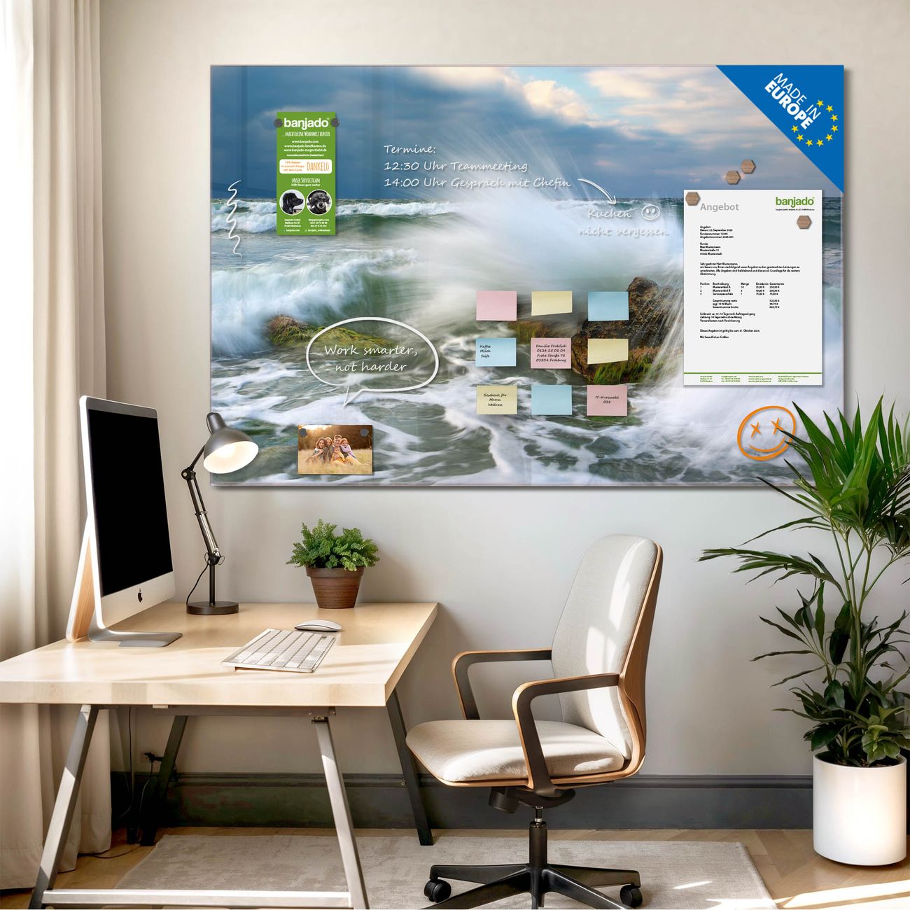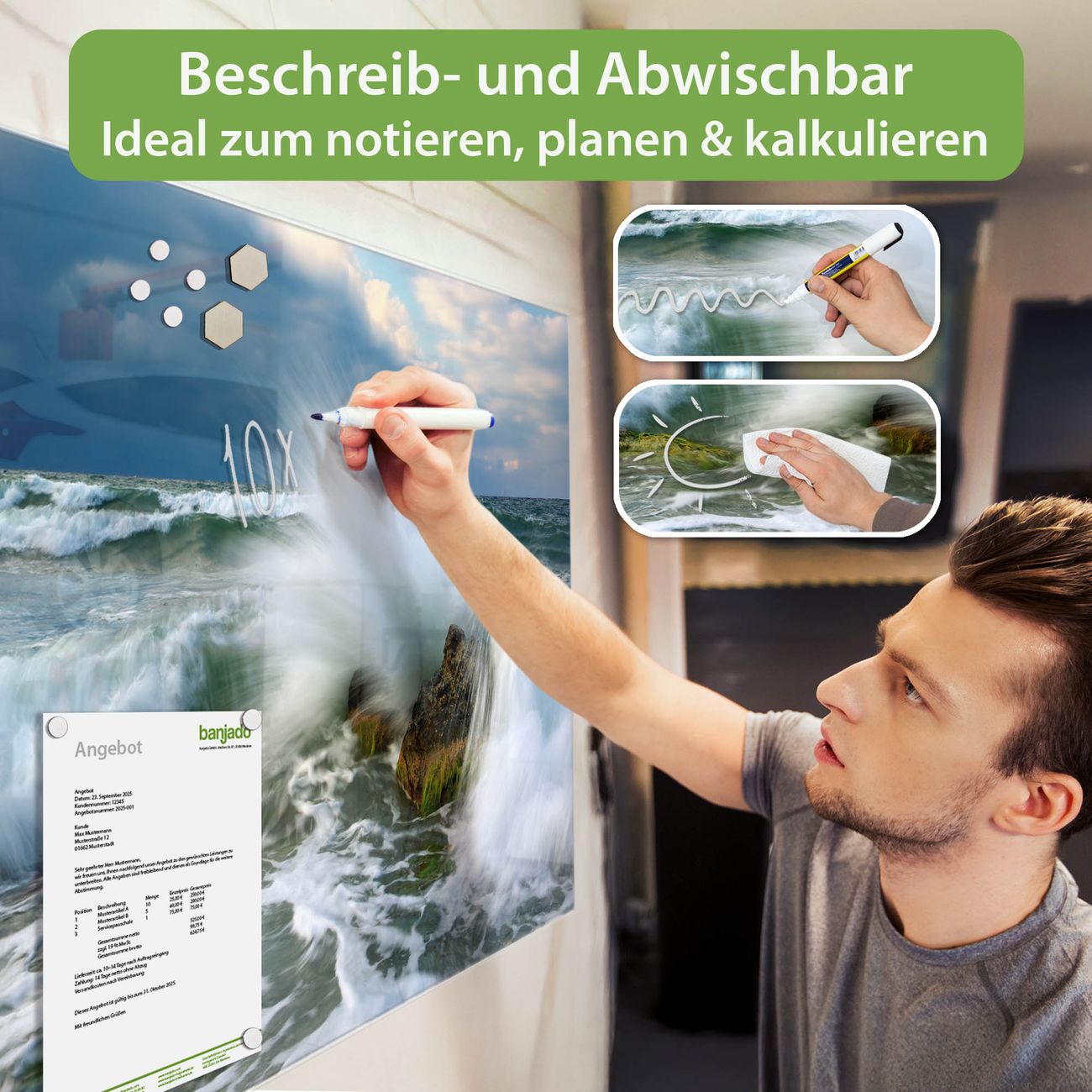 Jede Glas Magnettafel wird in unserer Werkstatt von Hand gefertigt und sorgfältig geprüft. So erhalten Sie ein echtes Qualitätsprodukt, das Funktion und Ästhetik perfekt vereint.?? Warum banjado?