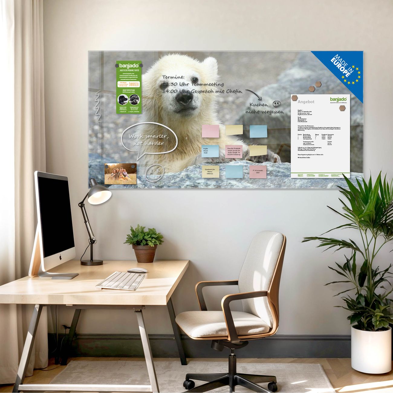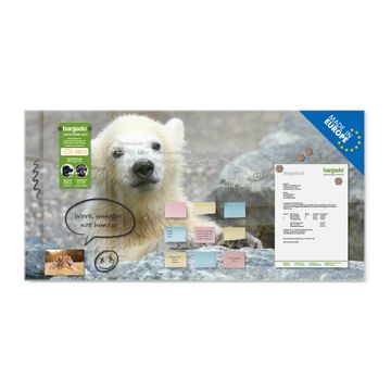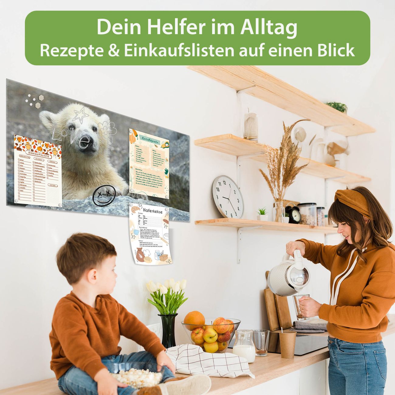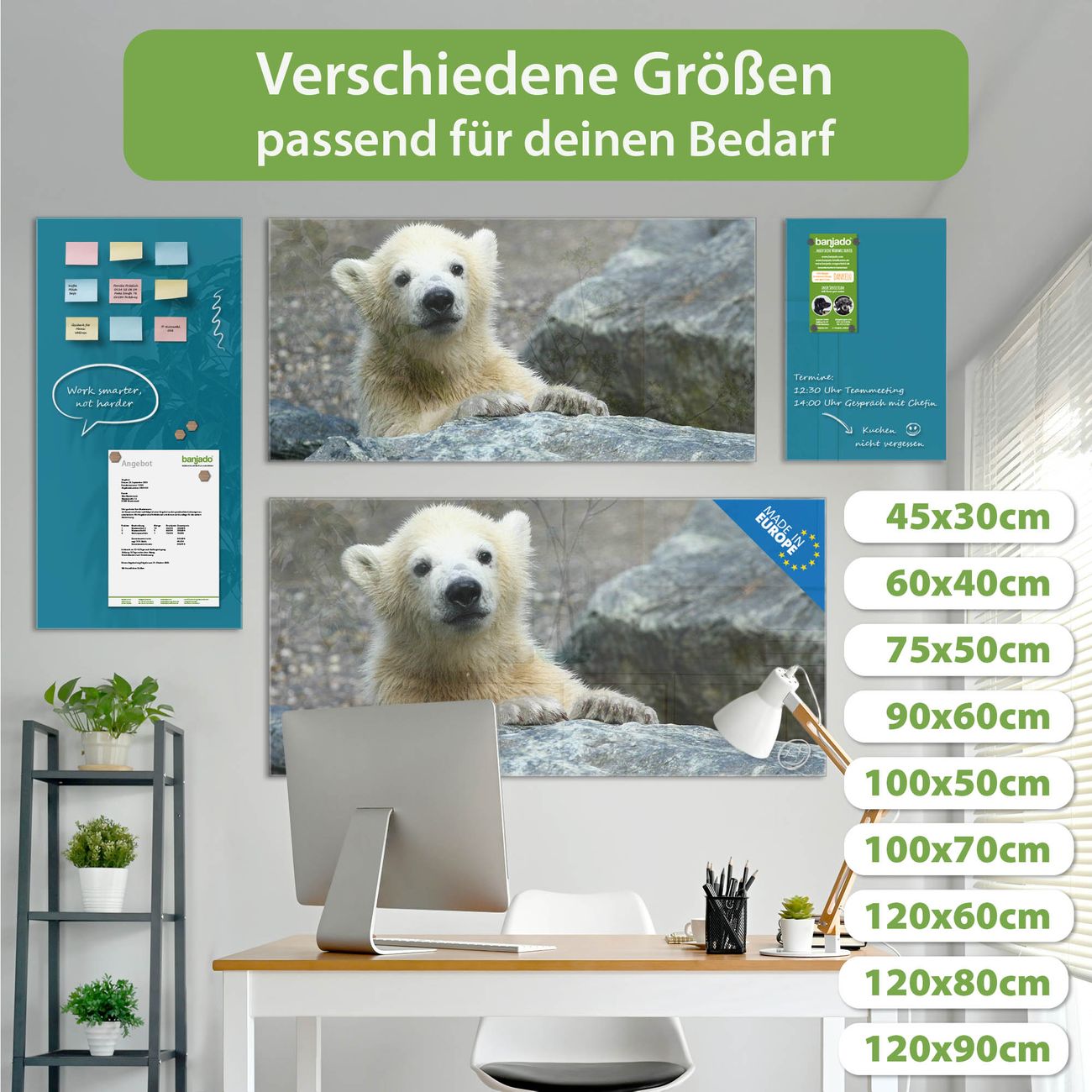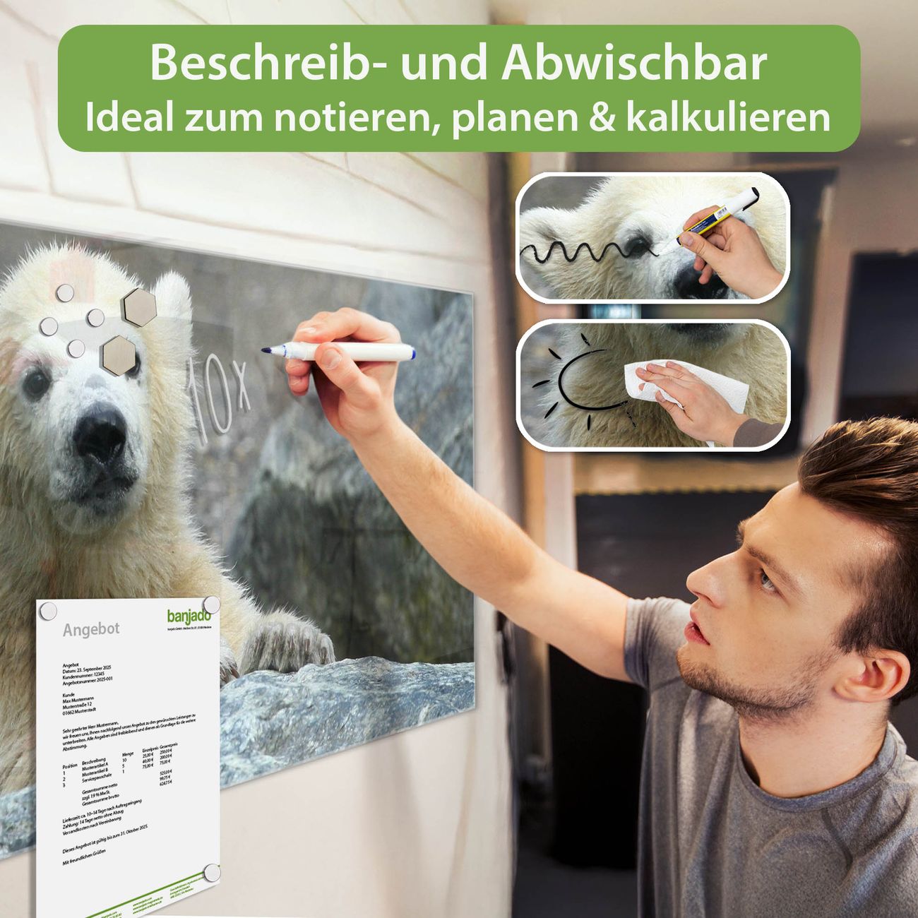 Material: 4mm Sicherheitsglas mit Metallrückwand Eigenschaften: beschreibbar, magnetisch, kratzfest Maße: 100x50x0,6cm, 7,50kg schwer Motiv Nummer 10038 Eisbär Baby Zubehör: inklusive 4 Neodym-Magnete