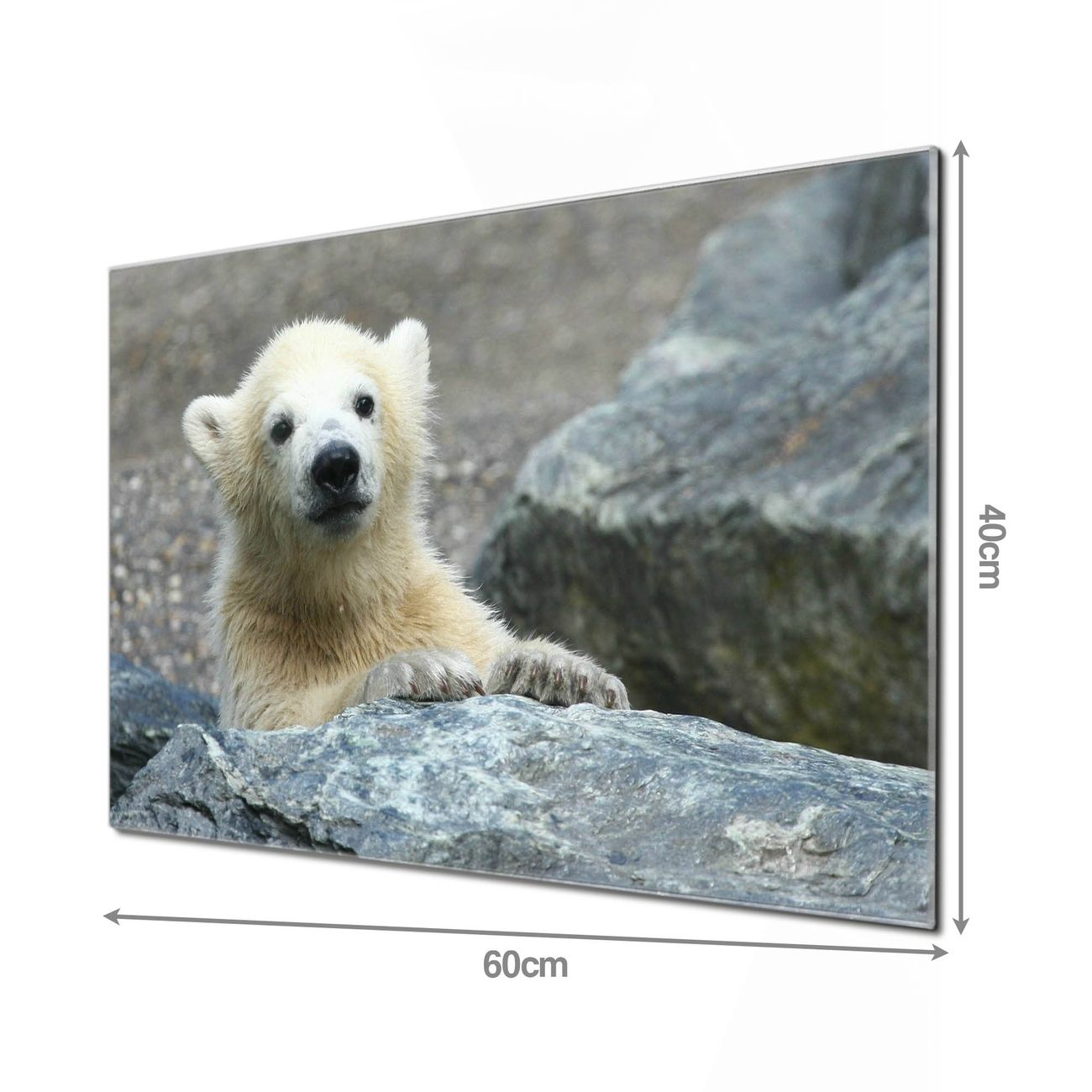 Material: 4mm Sicherheitsglas mit Metallrückwand Eigenschaften: beschreibbar, magnetisch, kratzfest Maße: 60x40x0,6cm, 3,6kg schwer Motiv Nummer 10038 Eisbär Baby Zubehör: inklusive 4 Neodym-Magnete