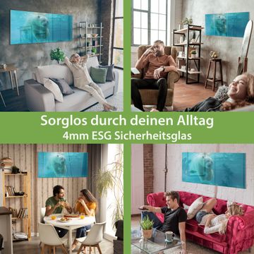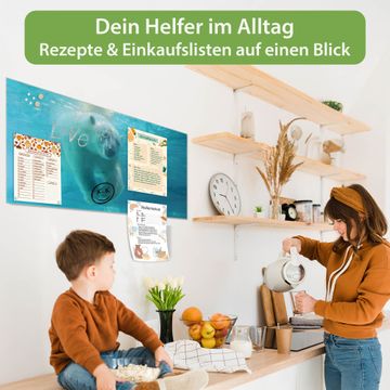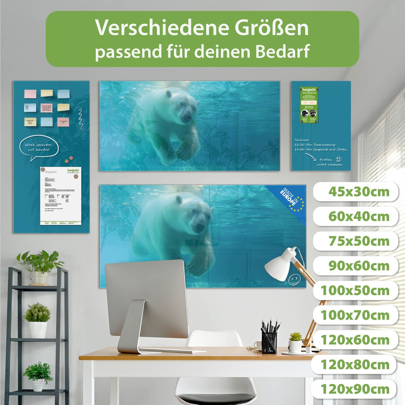 Material: 4mm Sicherheitsglas mit Metallrückwand Eigenschaften: beschreibbar, magnetisch, kratzfest Maße: 100x50x0,6cm, 7,50kg schwer Motiv Nummer 12548 Eisbär unter Wasser Zubehör: inklusive 4 Neodym-Magnete
