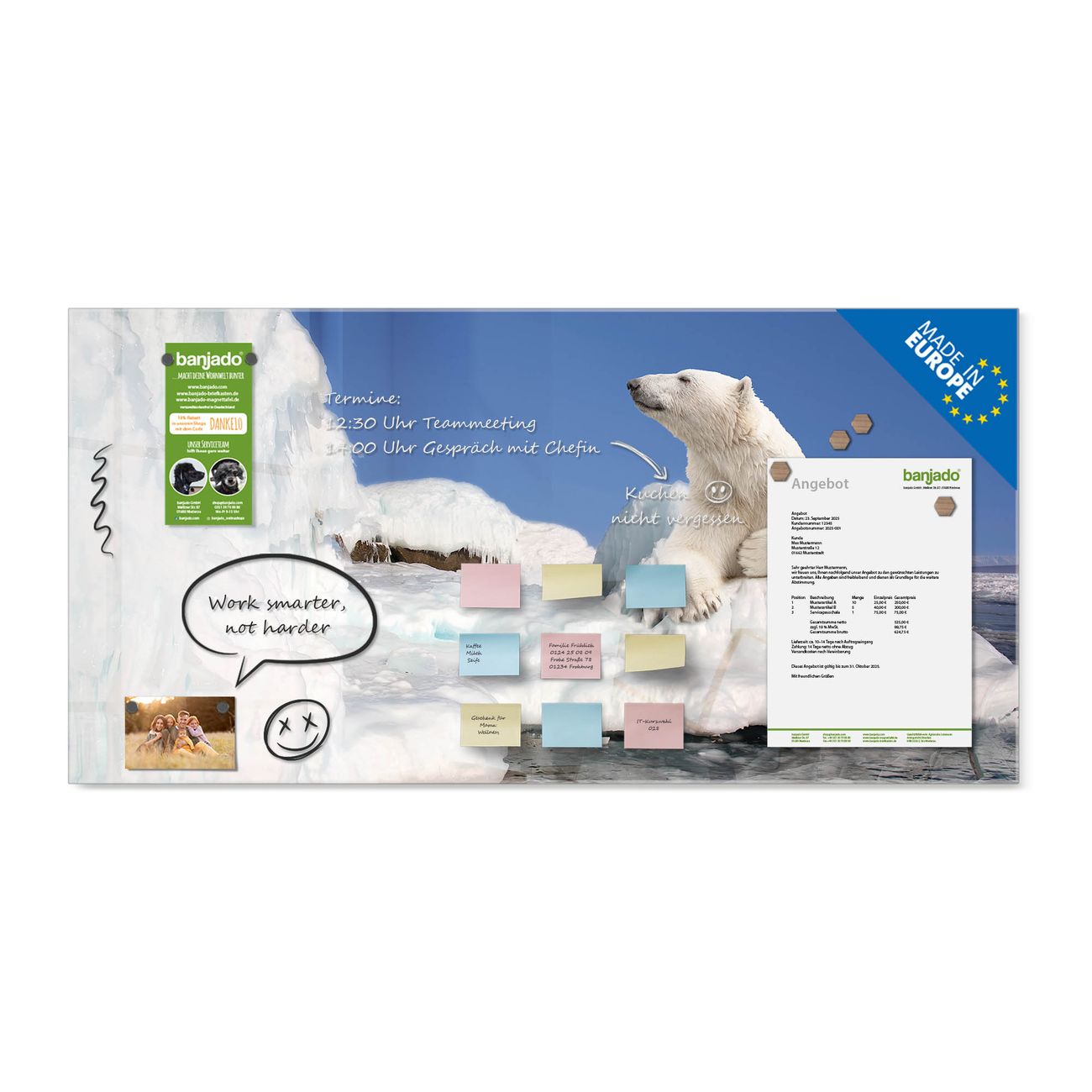 Jede Glas Magnettafel wird in unserer Werkstatt von Hand gefertigt und sorgfältig geprüft. So erhalten Sie ein echtes Qualitätsprodukt, das Funktion und Ästhetik perfekt vereint.?? Warum banjado?