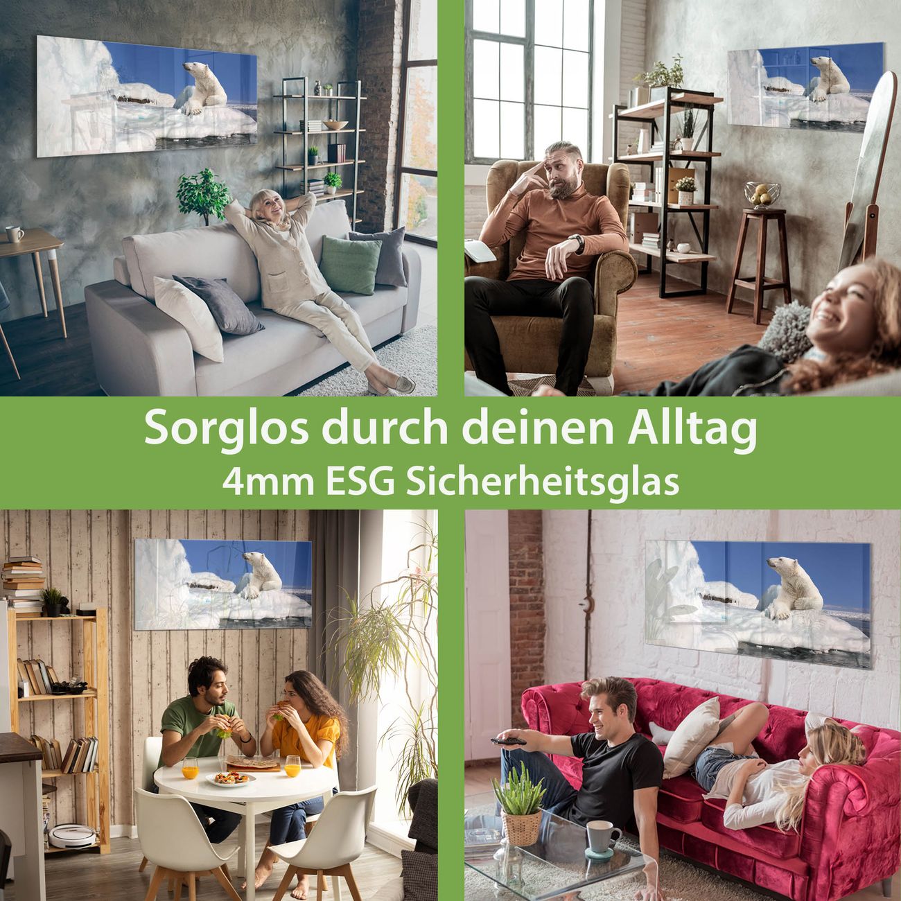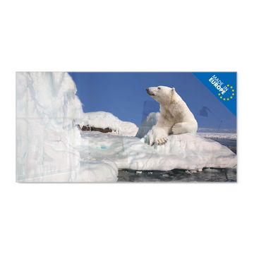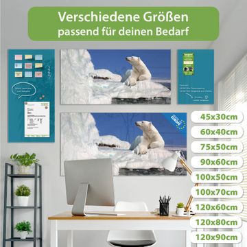 Material: 4mm Sicherheitsglas mit Metallrückwand Eigenschaften: beschreibbar, magnetisch, kratzfest Maße: 120x60x0,6cm, 10,80kg schwer Motiv Nummer 10491 Ruhender Eisbär Zubehör: inklusive 4 Neodym-Magnete
