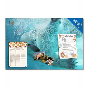 Material: 4mm Sicherheitsglas mit Metallrückwand Eigenschaften: beschreibbar, magnetisch, kratzfest Maße: 45x30x0,6cm, 2,03kg schwer Motiv Nummer 12358 Tauchender Eisbär Zubehör: inklusive 4 Neodym-Magnete