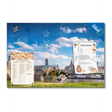 Material: 4mm Sicherheitsglas mit Metallrückwand Eigenschaften: beschreibbar, magnetisch, kratzfest Maße: 60x40x0,6cm, 3,6kg schwer Motiv Nummer 12753 Elbflorenz Zubehör: inklusive 4 Neodym-Magnete