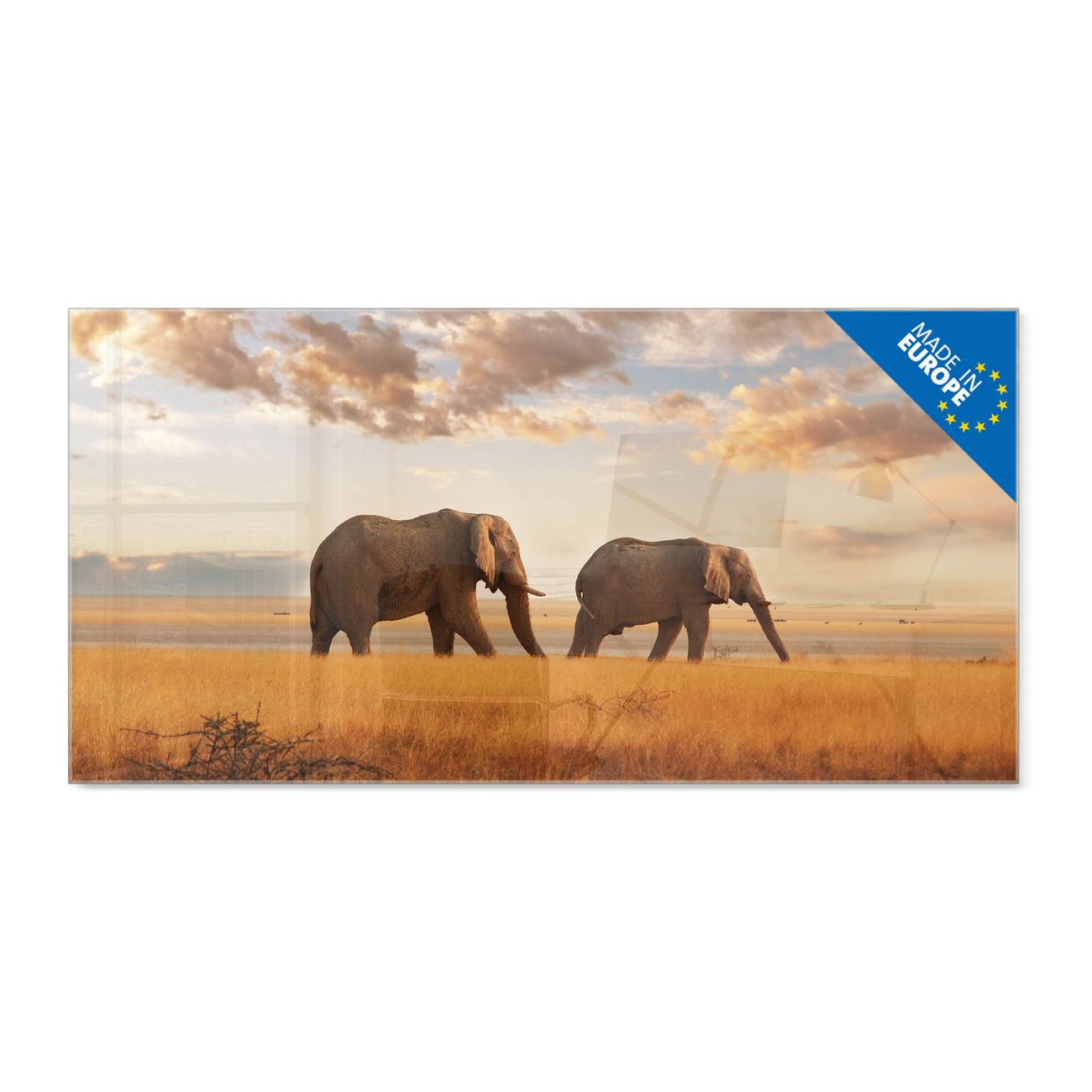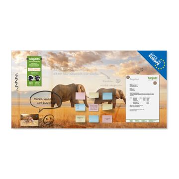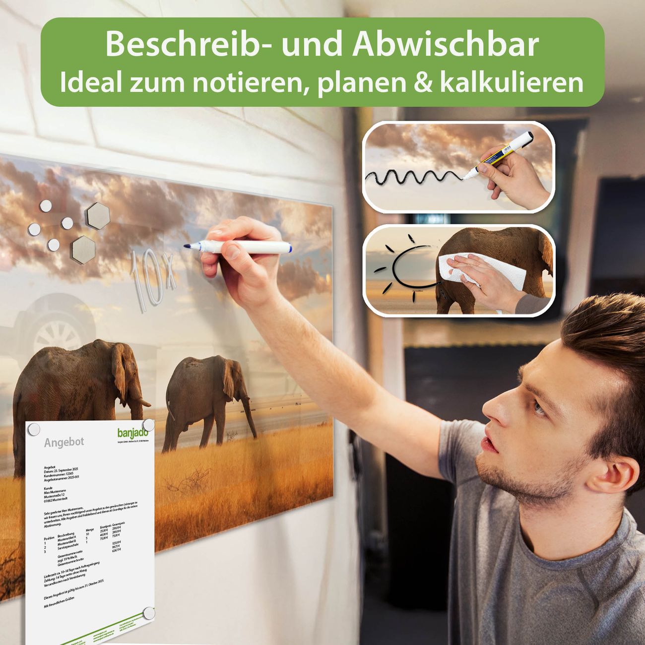 Material: 4mm Sicherheitsglas mit Metallrückwand Eigenschaften: beschreibbar, magnetisch, kratzfest Maße: 100x50x0,6cm, 7,50kg schwer Motiv Nummer 10488 Elefanten Zubehör: inklusive 4 Neodym-Magnete