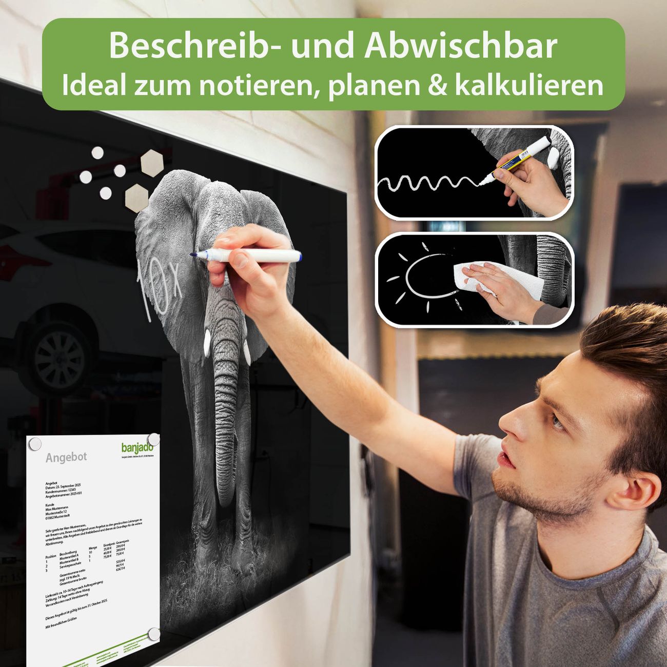 Bitte beachten Sie, dass ausschliessliche spezielle Magnete an der Glastafel haften. Wir empfehlen banjado Neodym Magnete, diese sind durch uns auf Wirksamkeit geprüft.