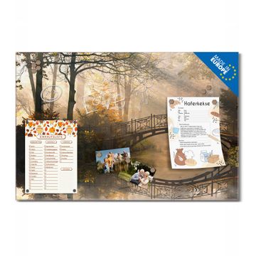 Material: 4mm Sicherheitsglas mit Metallrückwand Eigenschaften: beschreibbar, magnetisch, kratzfest Maße: 75x50x0,6cm, 5,63kg schwer Motiv Nummer 10450 Englischer Garten Zubehör: inklusive 4 Neodym-Magnete