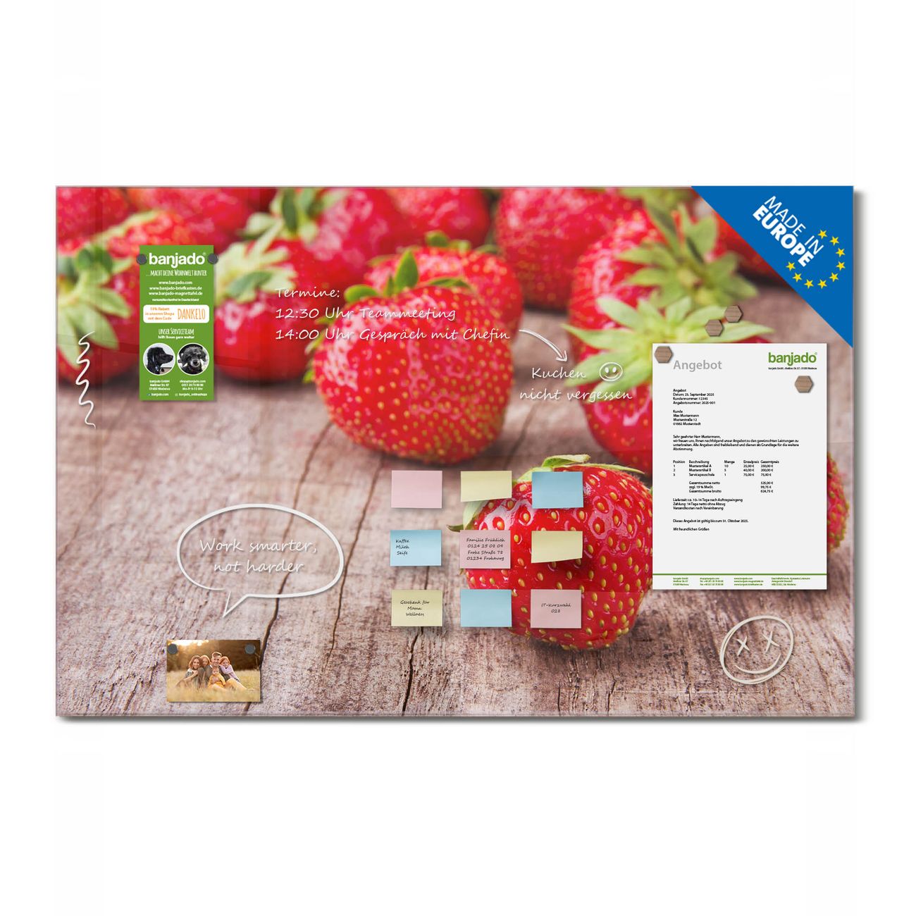 Material: 4mm Sicherheitsglas mit Metallrückwand Eigenschaften: beschreibbar, magnetisch, kratzfest Maße: 120x80x0,6cm, 14,40kg schwer Motiv Nummer 11815 Erdbeeren Zubehör: inklusive 4 Neodym-Magnete