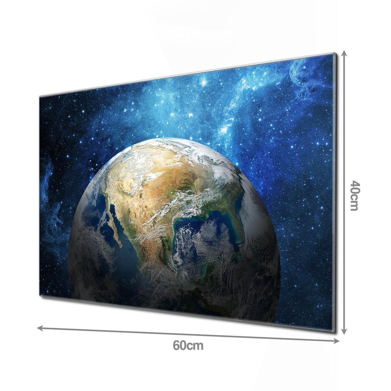 Material: 4mm Sicherheitsglas mit Metallrückwand Eigenschaften: beschreibbar, magnetisch, kratzfest Maße: 60x40x0,6cm, 3,6kg schwer Motiv Nummer 10643 Erdkugel Zubehör: inklusive 4 Neodym-Magnete