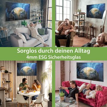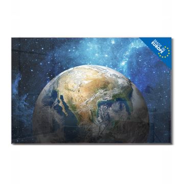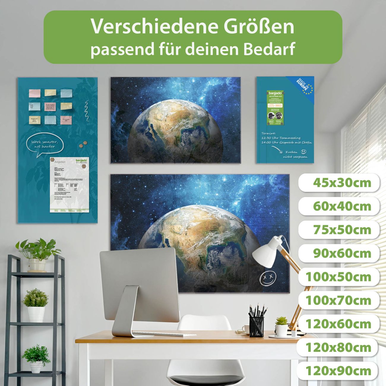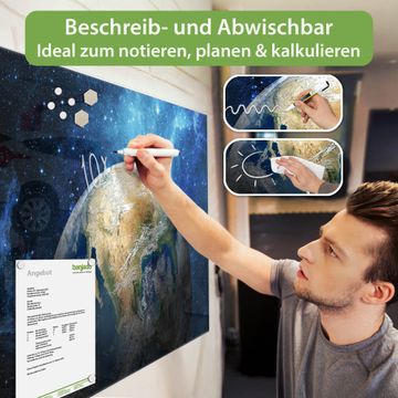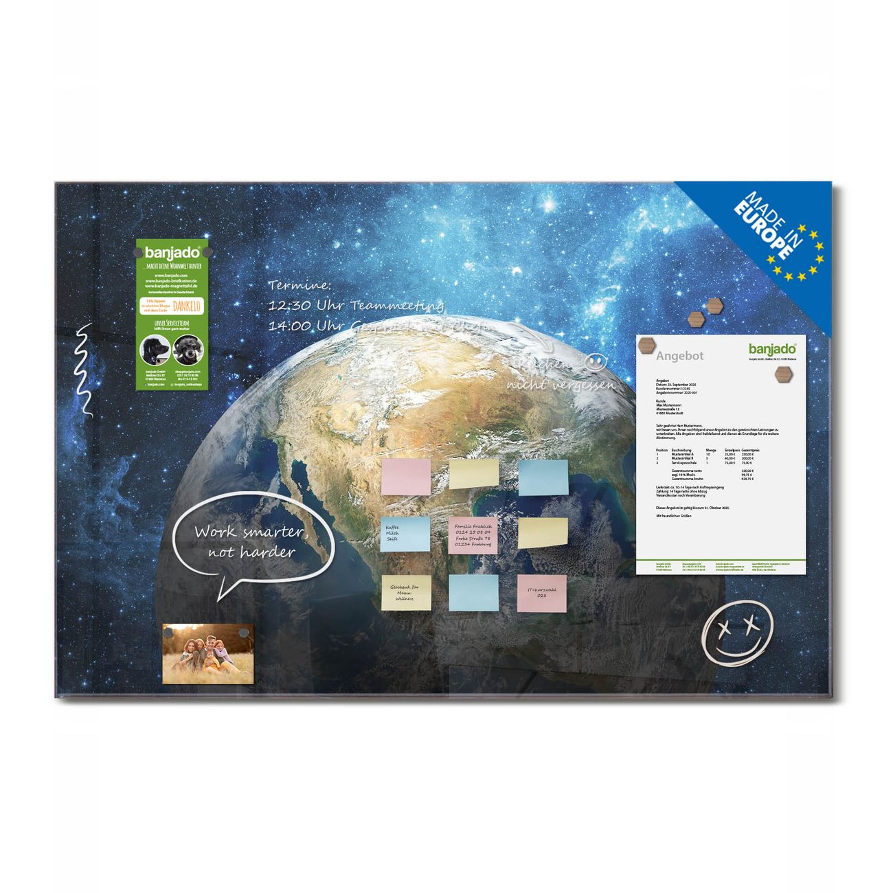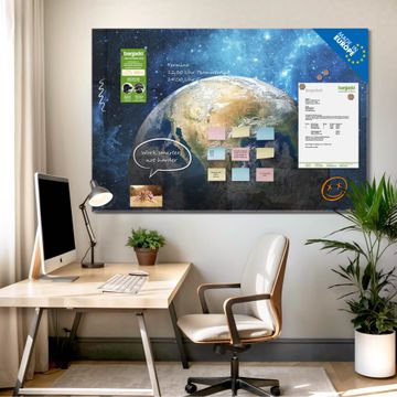 Material: 4mm Sicherheitsglas mit Metallrückwand Eigenschaften: beschreibbar, magnetisch, kratzfest Maße: 90x60x0,6cm, 8,10kg schwer Motiv Nummer 10643 Erdkugel Zubehör: inklusive 4 Neodym-Magnete