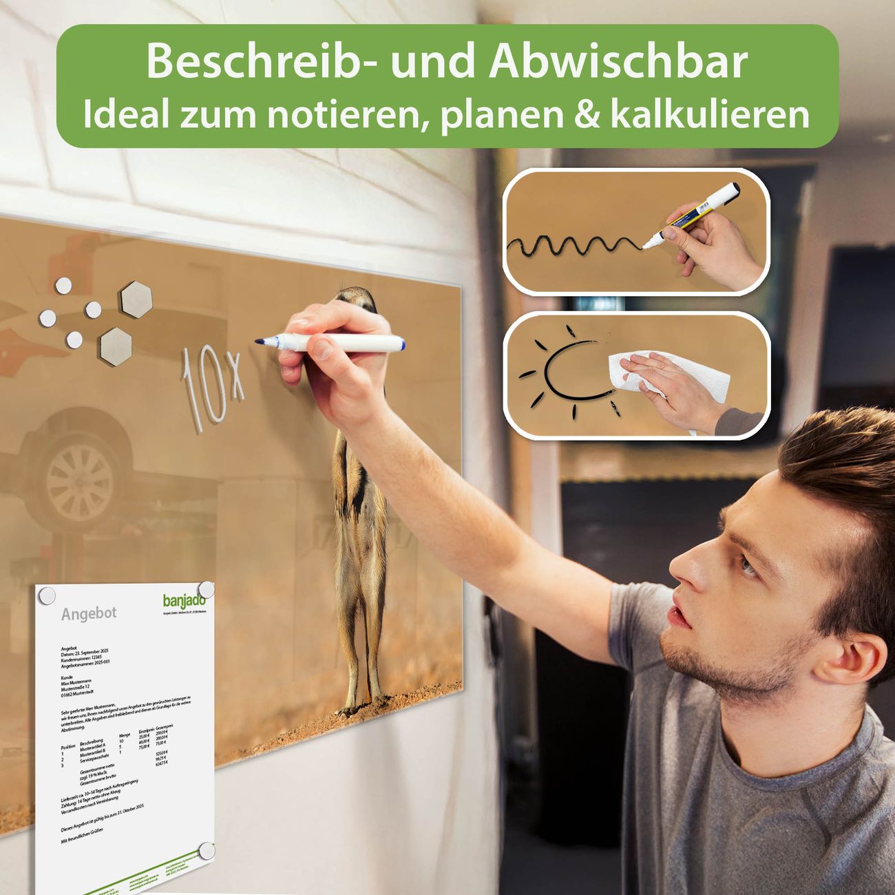 Bitte beachten Sie, dass ausschliessliche spezielle Magnete an der Glastafel haften. Wir empfehlen banjado Neodym Magnete, diese sind durch uns auf Wirksamkeit geprüft.