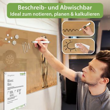 Material: 4mm Sicherheitsglas mit Metallrückwand Eigenschaften: beschreibbar, magnetisch, kratzfest Maße: 120x60x0,6cm, 10,80kg schwer Motiv Nummer 12757 Henryk 2 Zubehör: inklusive 4 Neodym-Magnete