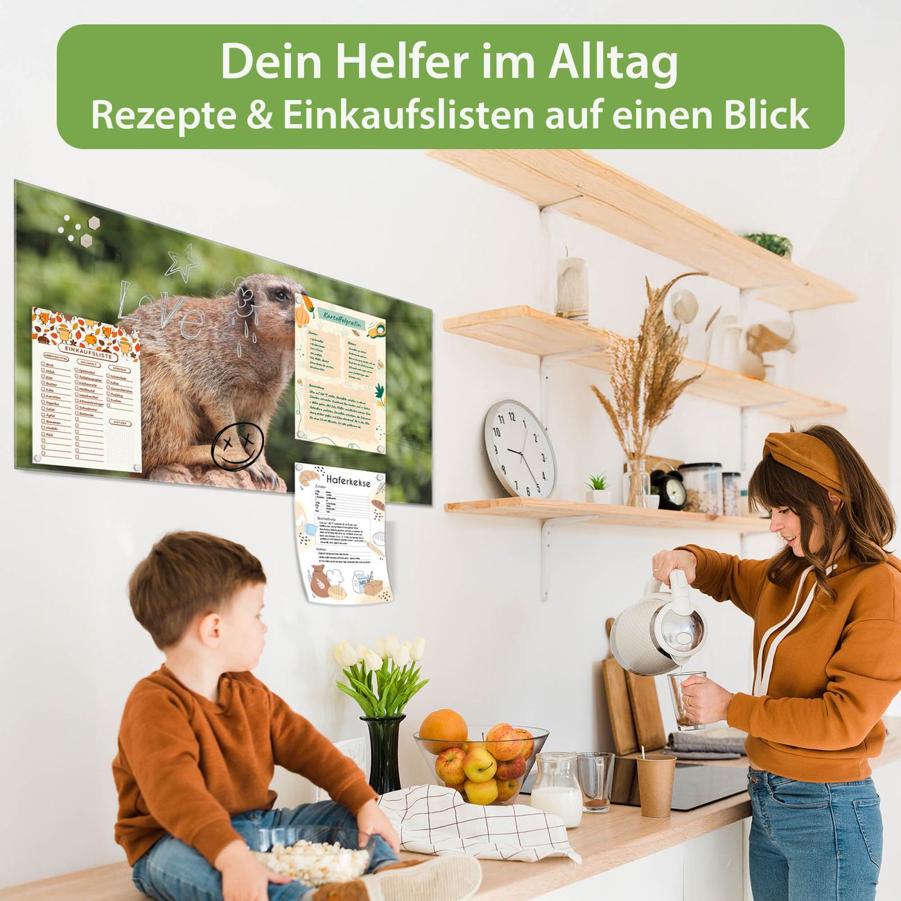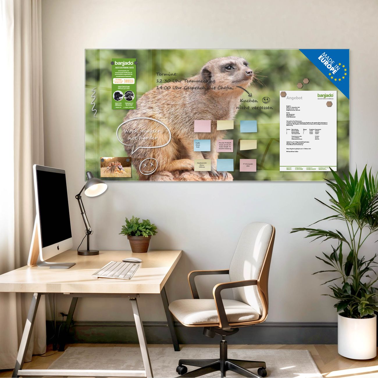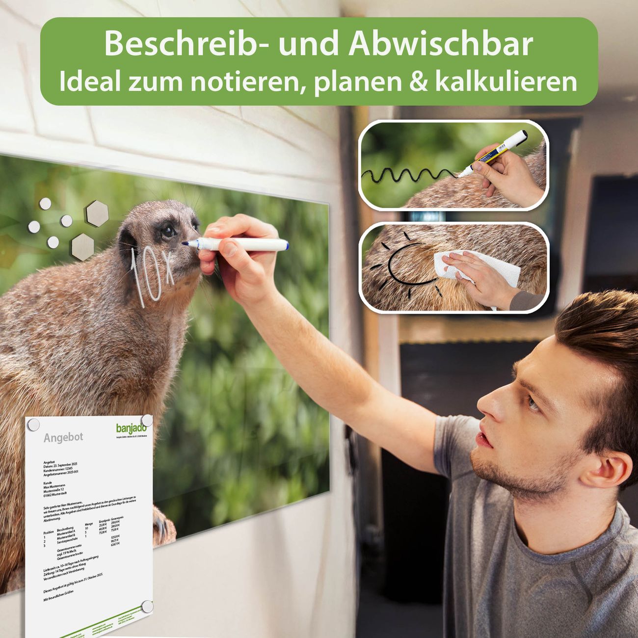 Die banjado Glas Magnettafel mit dem Motiv Motiv Sitzendes Erdmännchen verbindet Funktionalität mit Stil. Sie ersetzt das Zettelchaos durch klare Strukturen und bringt dabei eine warme, natürliche Atmosphäre in Ihr Zuhause. Ob im Büro, in der Küche oder im Eingangsbereich - dieses Design-Board zieht Blicke an und sorgt für Ordnung mit Charakter.