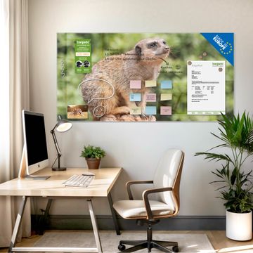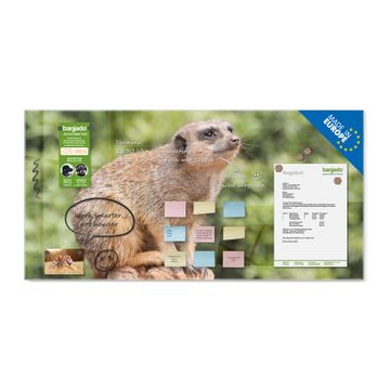 Material: 4mm Sicherheitsglas mit Metallrückwand Eigenschaften: beschreibbar, magnetisch, kratzfest Maße: 100x50x0,6cm, 7,50kg schwer Motiv Nummer 10284 Sitzendes Erdmännchen Zubehör: inklusive 4 Neodym-Magnete