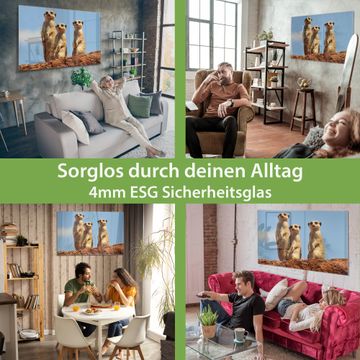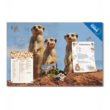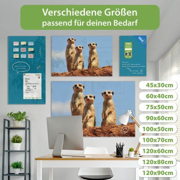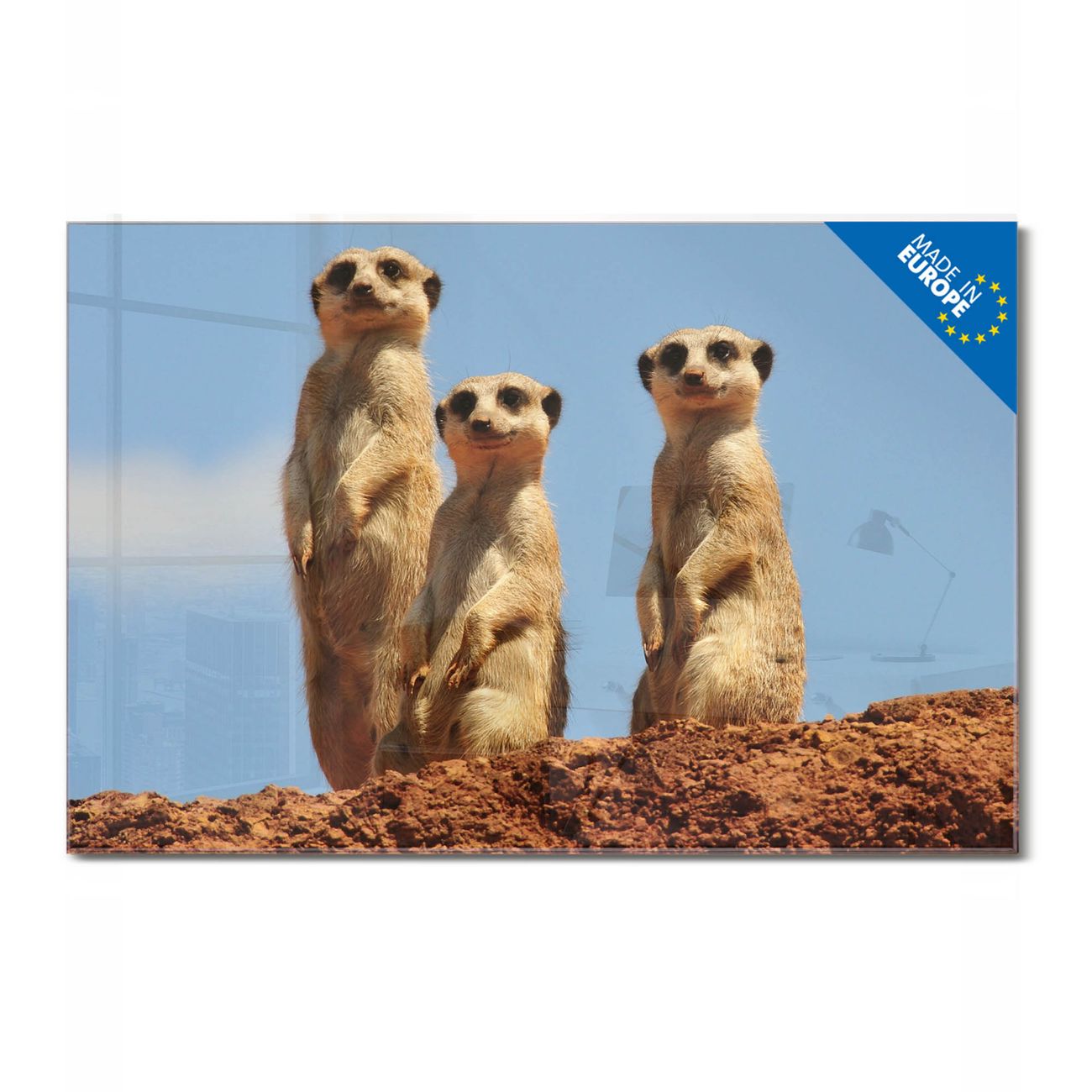 Material: 4mm Sicherheitsglas mit Metallrückwand Eigenschaften: beschreibbar, magnetisch, kratzfest Maße: 60x40x0,6cm, 3,6kg schwer Motiv Nummer 10297 Erdmännchenfamilie Zubehör: inklusive 4 Neodym-Magnete