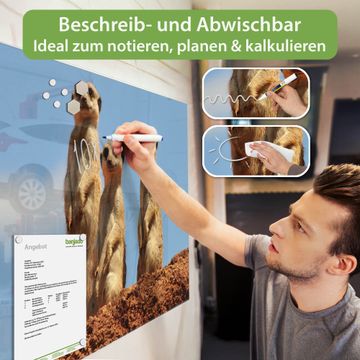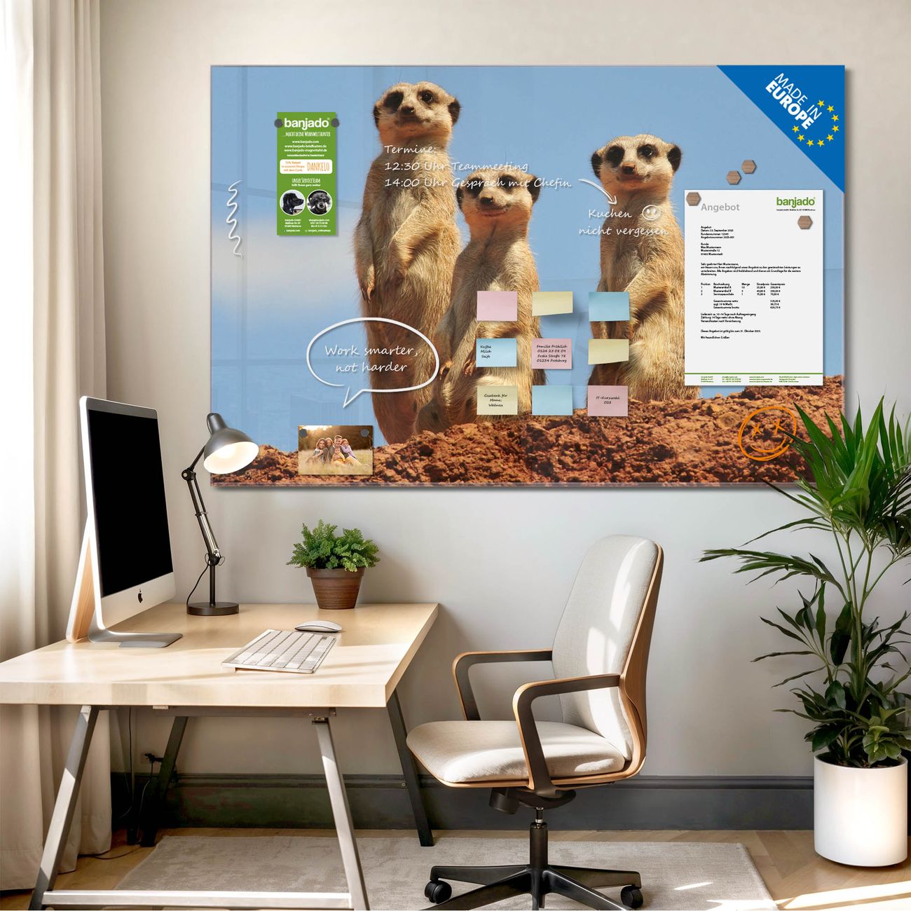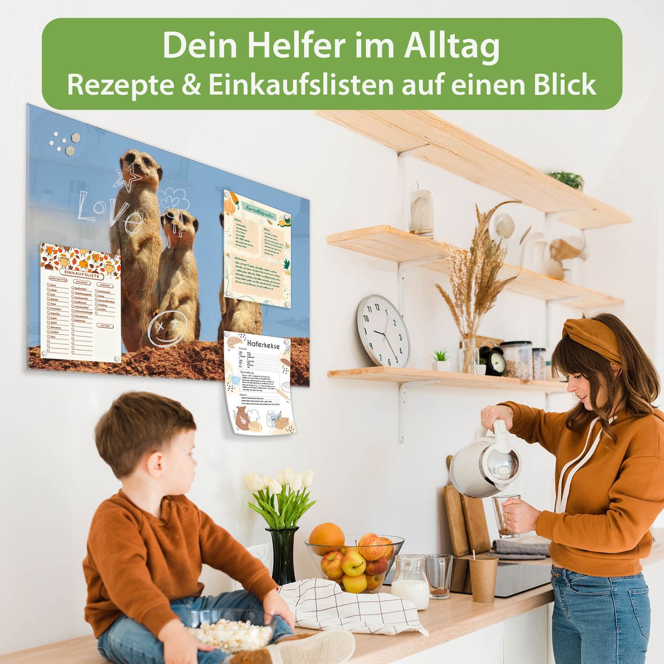 Die banjado Glas Magnettafel mit dem Motiv Motiv Erdmännchenfamilie verbindet Funktionalität mit Stil. Sie ersetzt das Zettelchaos durch klare Strukturen und bringt dabei eine warme, natürliche Atmosphäre in Ihr Zuhause. Ob im Büro, in der Küche oder im Eingangsbereich - dieses Design-Board zieht Blicke an und sorgt für Ordnung mit Charakter.